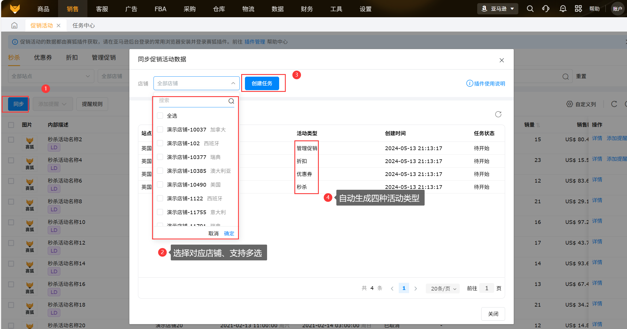 需要亚马逊店铺和插件同时在线,同一个店铺会同时生成获取4种活动类型的任务,例如用户勾选美国站店铺,创建任务,会同时生成秒杀、优惠券、折扣、管理促销四种活动类型的获取任务。