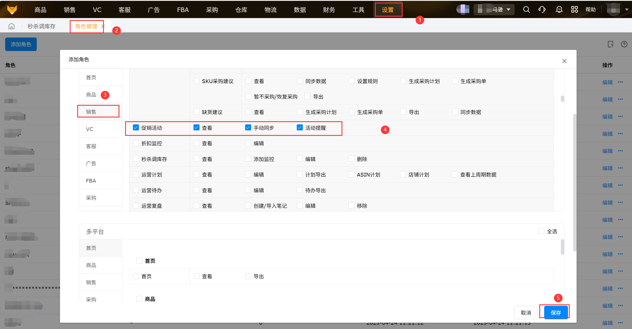 主账号需要给子账号分配促销活动模块的权限,【设置-角色管理-销售-勾选促销活动相关权限】。