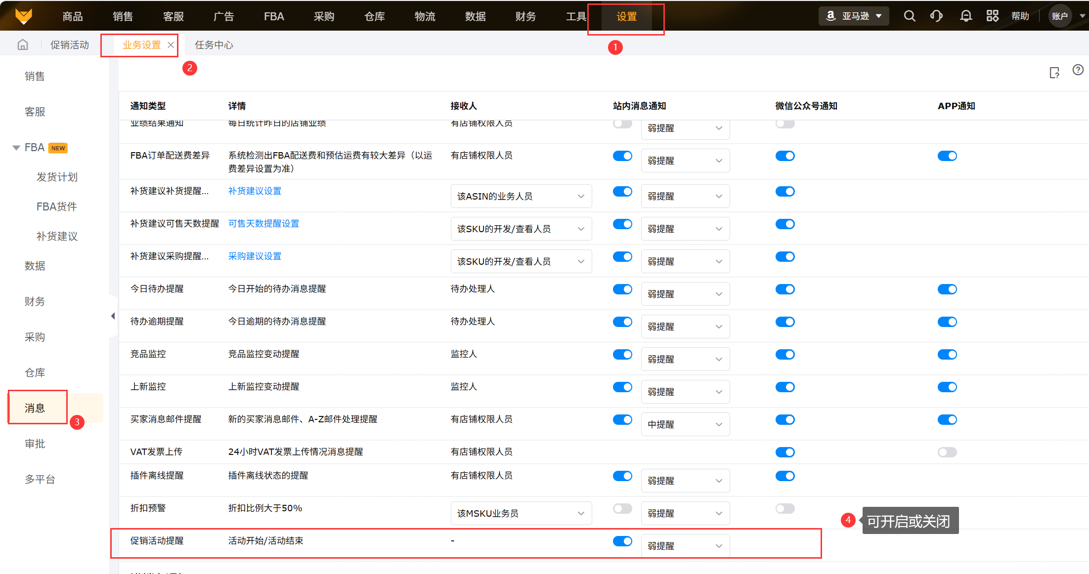 如果对应子账号不想接收消息,可以通过设置消息,找到促销活动提醒,关闭开关即可。