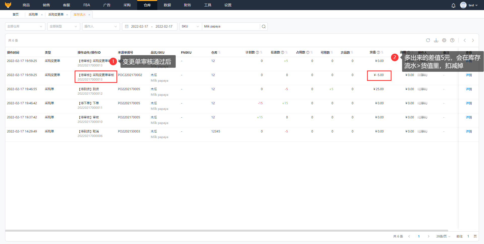 如上表所示,采购单A已到货的5个商品,货值由25元变更为20元,多出的5元差值将扣减掉,可在【库存流水】查看该变更记录。