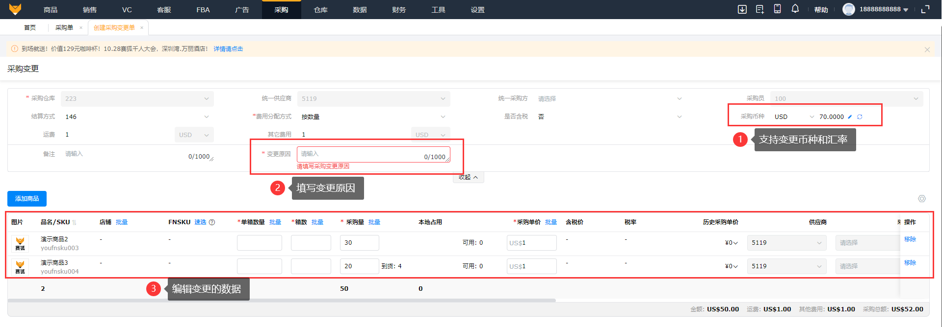 在【采购单】待下单或待到货状态,点击“...”,选择“采购变更”,填写变更原因,编辑变更后的数据,点击提交;