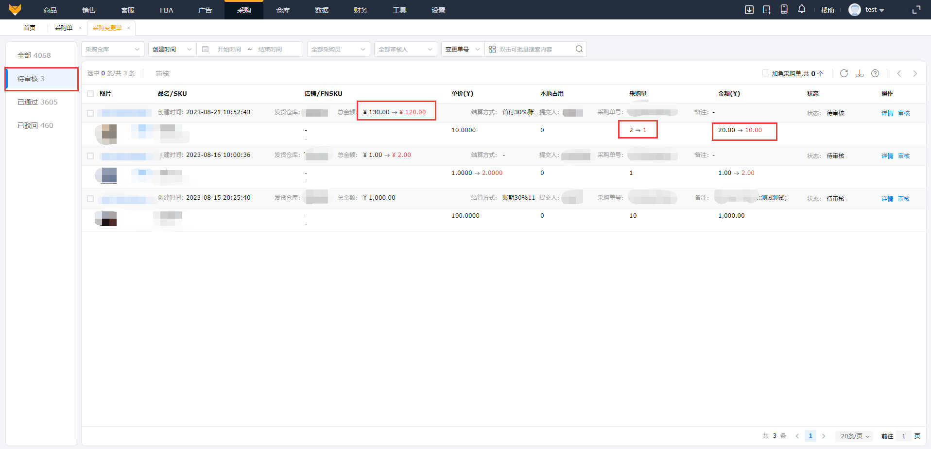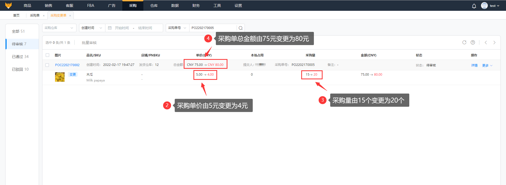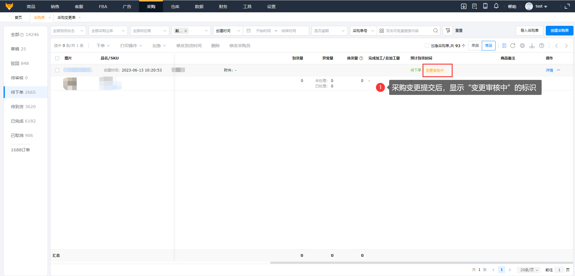 提交后,该采购单会显示“变更审批中”的标识。