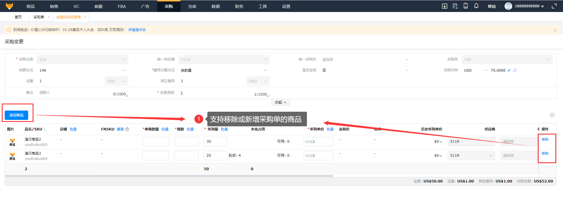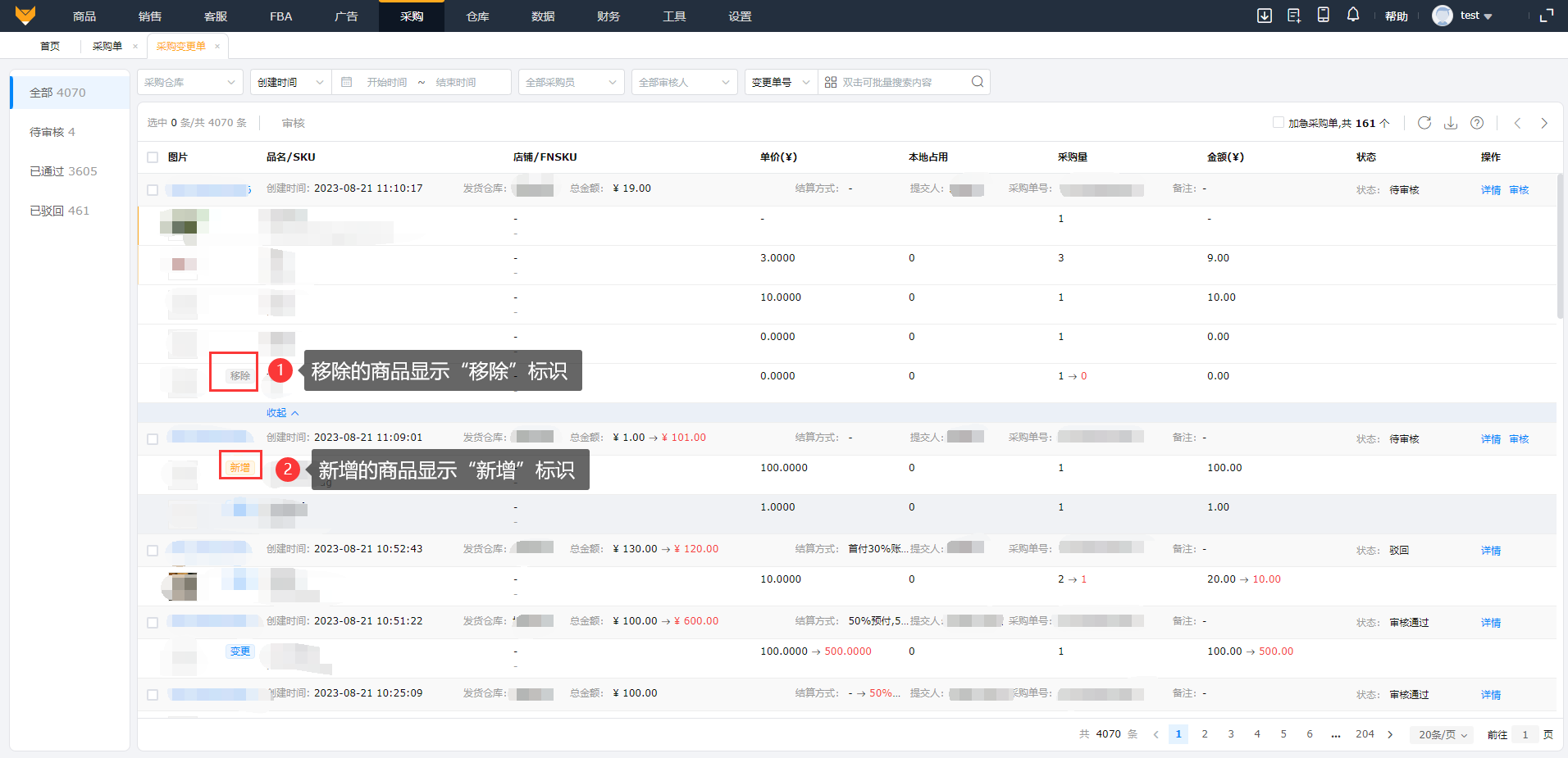 (2)支持使用变更单移除或新增采购单的商品,在变更单审核页面,移除掉的商品显示“移除”标识,新增加的商品显示“新增”标识。