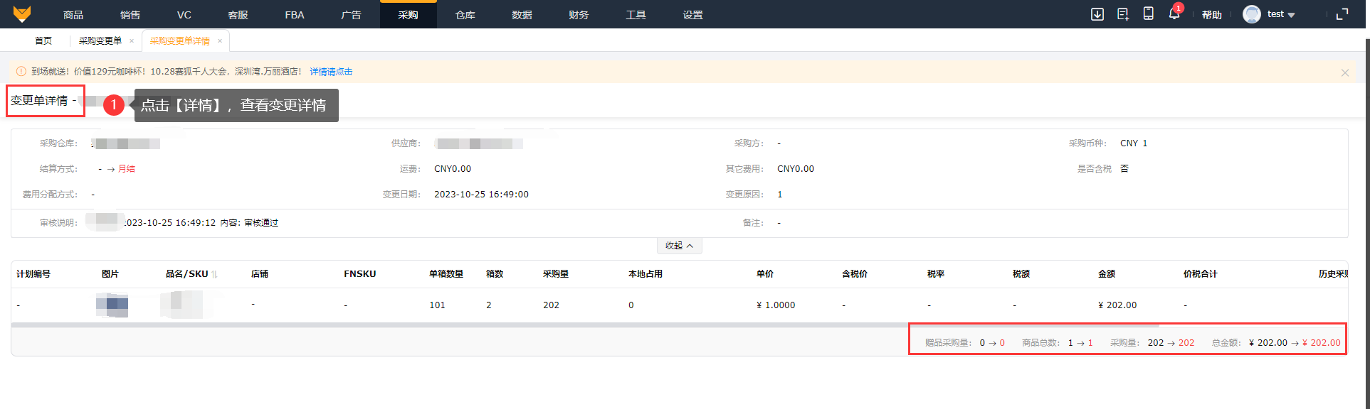 (4)已通过或已驳回的采购单,可以在“已通过”、“已驳回”状态页面查找到相应变更单,并支持查看变更详情。