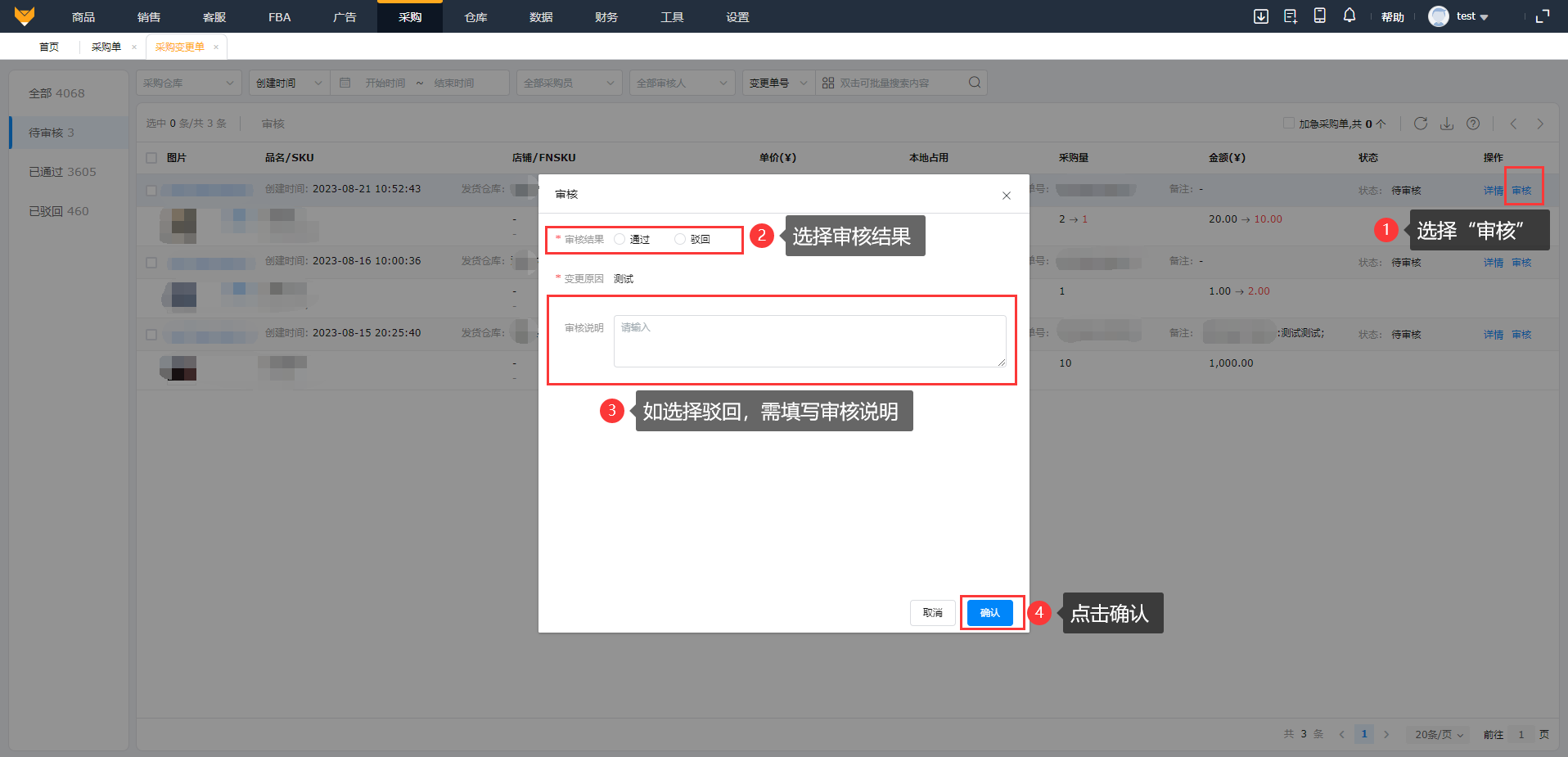 (1) 进入【采购】>【采购变更单】页面,提交过来的变更单会显示在待审核状态里,变更信息在列表标红显示,点击“更多”,选择“审核”,驳回变更单时,审核说明为必填项;