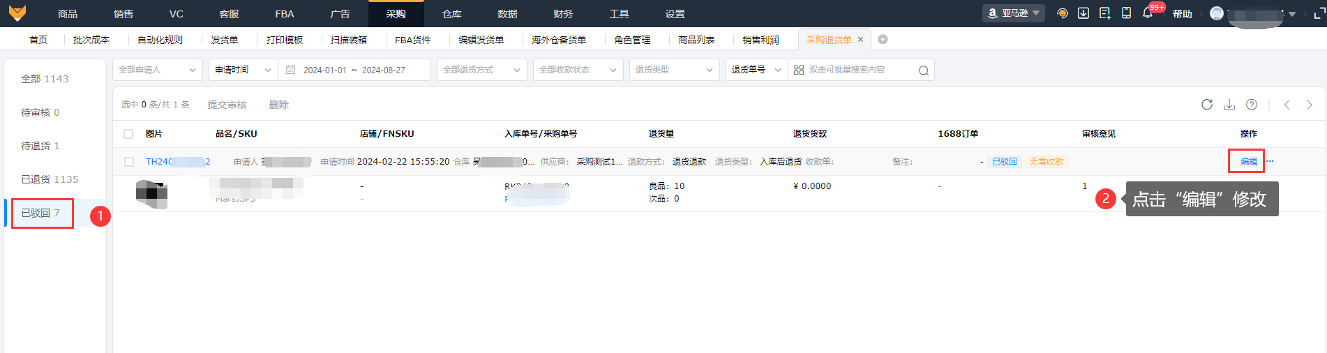 A1:采购退货不会同步到1688后台,采购退货是针对赛狐这边已经入库的产品可以退货,扣减库存的。