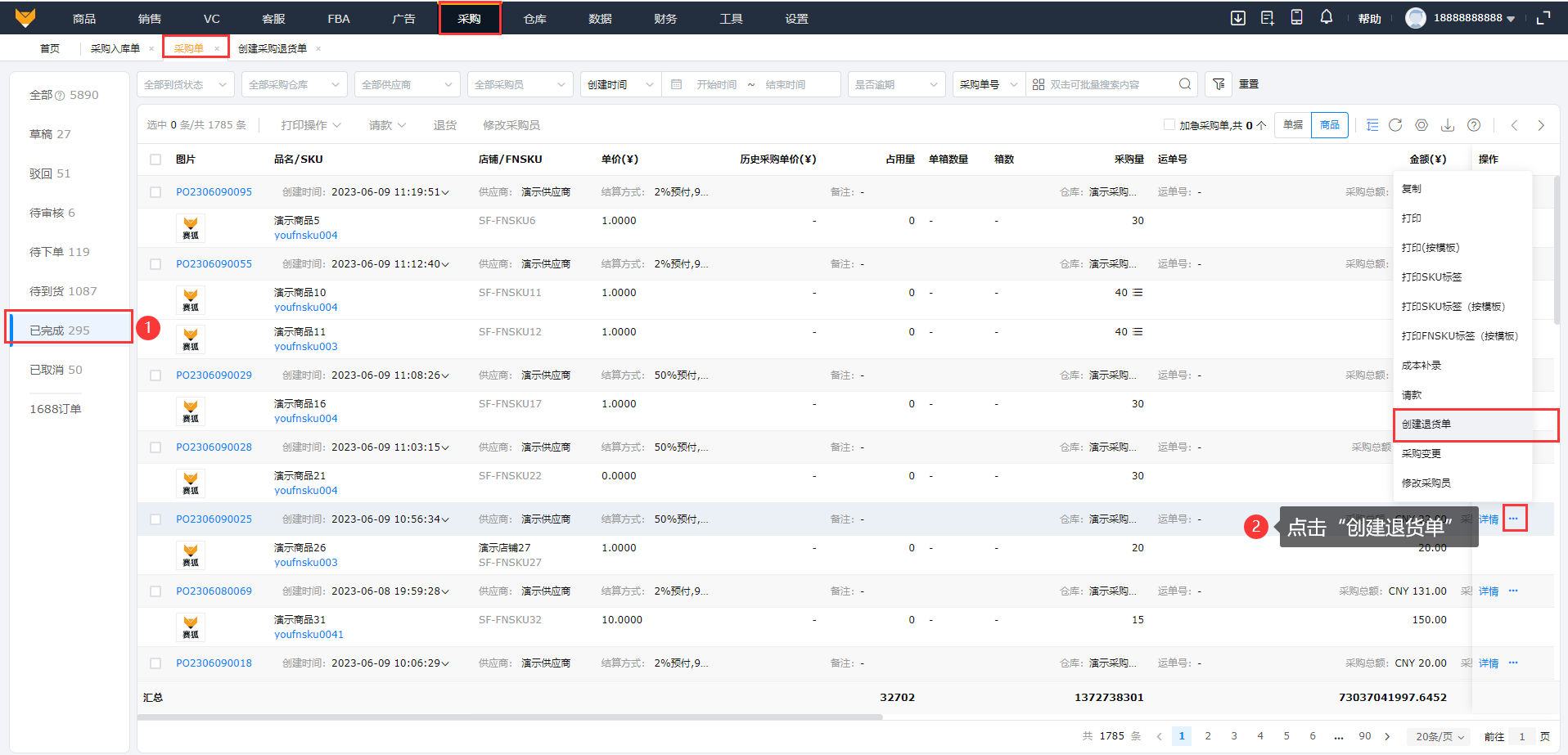 (1)入口1:【采购】> 【采购单】> 【已完成】> 点击“更多”中的【创建退货单】