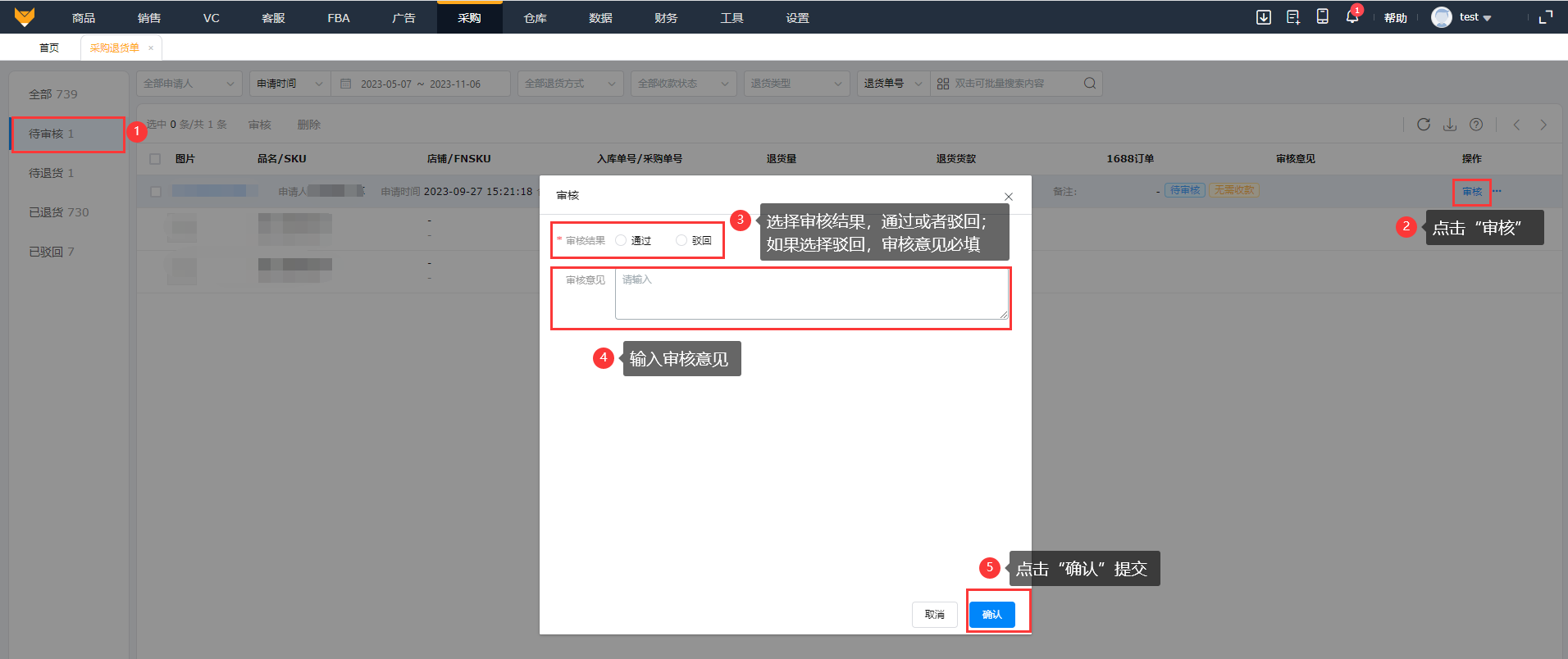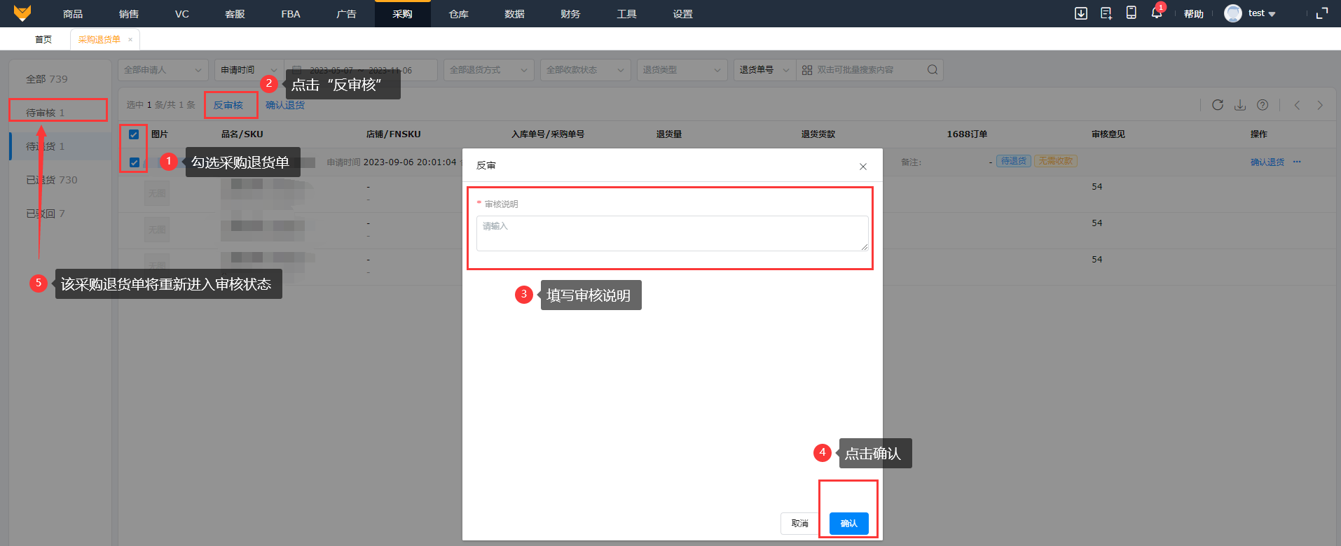 点击更多,可以选择“反审核”,填写反审核说明,该退货单将重新回到“待审核”状态,可以再次进行审核。
