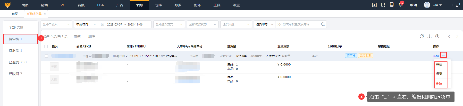 ②点击更多,可以查看退货单详情、编辑和删除退货单。