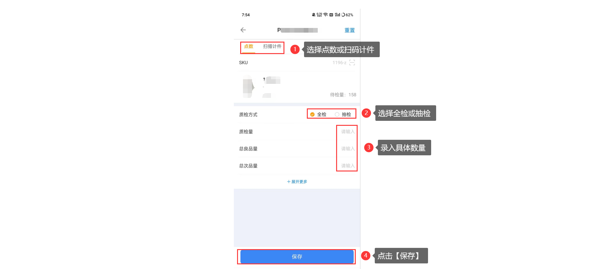 质检详情页,可选择点数或者扫描计件方式质检,质检方式选择全检或者是抽检,根据质检内容填写好质检量和良次品数量,点击保存完成该商品质检点数:可直接输入质检量完成质检