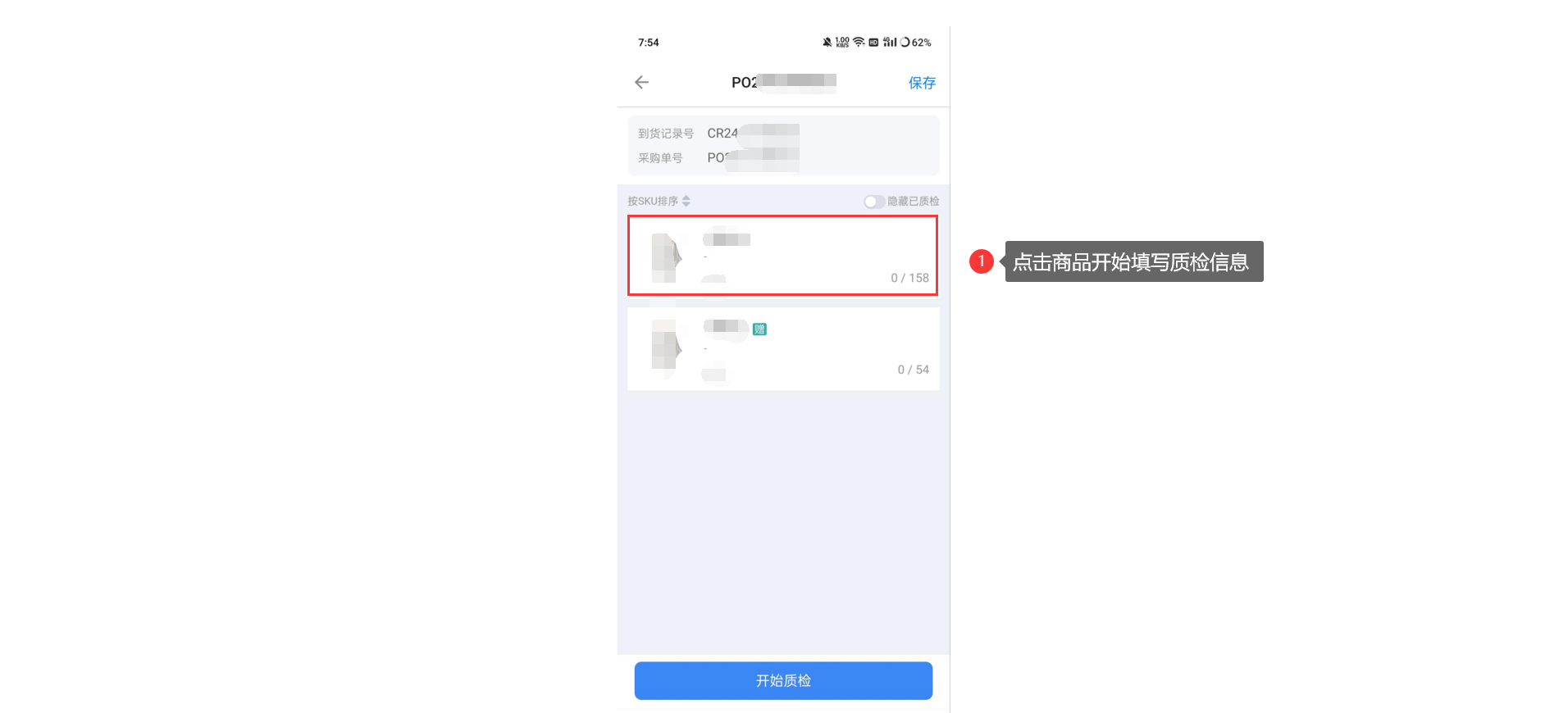 点击【开始质检】进入质检单详情页面,列表会展示单据中需要质检的产品信息,可以点击商品开始质检,如果单据中需要质检的商品较多,也可以【开始质检】搜索商品或者扫描确认信息
