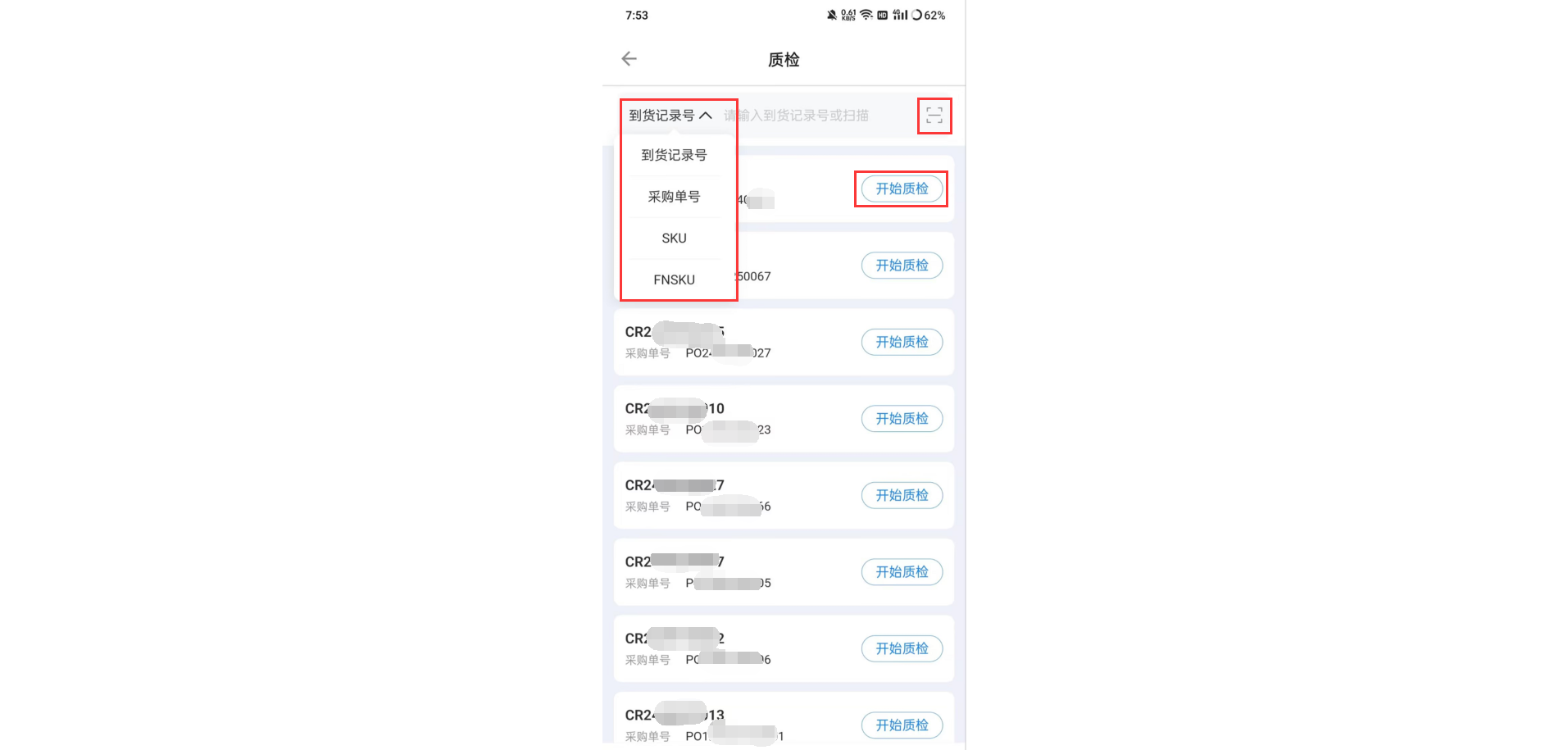 1.2支持按照到货记录号、采购单号、SKU和FNSKU搜索单据;或者是通过扫描确认质检单据,点击【开始质检】