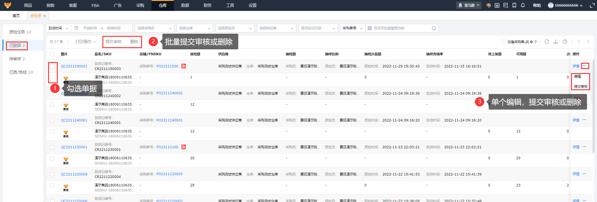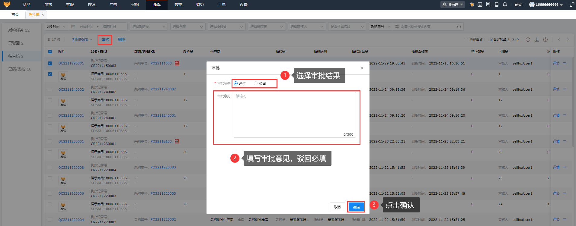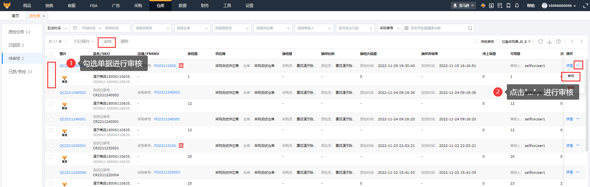 开启了质检单的审核流程,在操作质检完成后,质检单会流转到待审核;可在待审核页面审核质检后的单据。