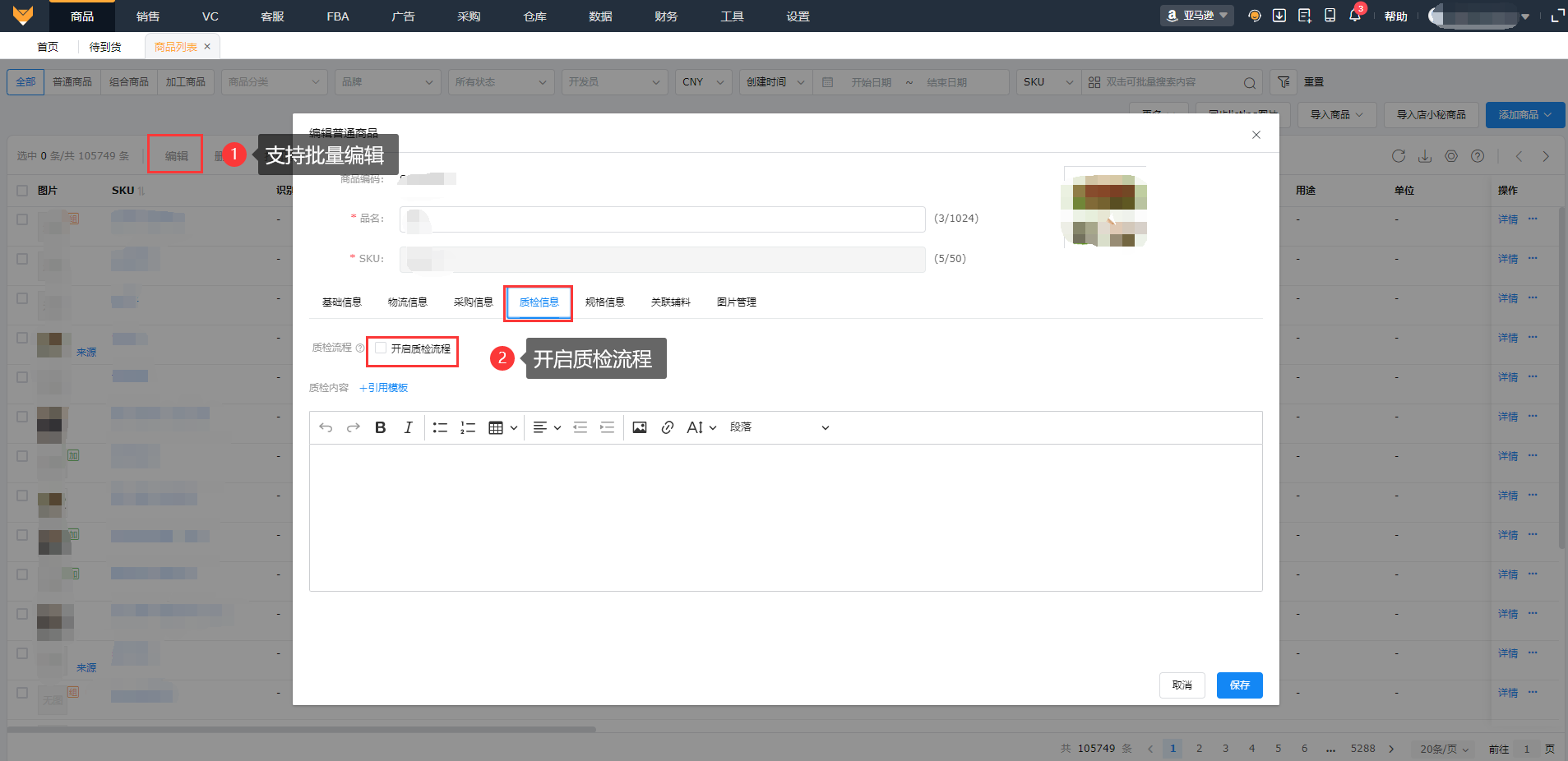 1.2在【商品列表】里给需要质检的商品,开启“质检流程”,支持批量编辑;