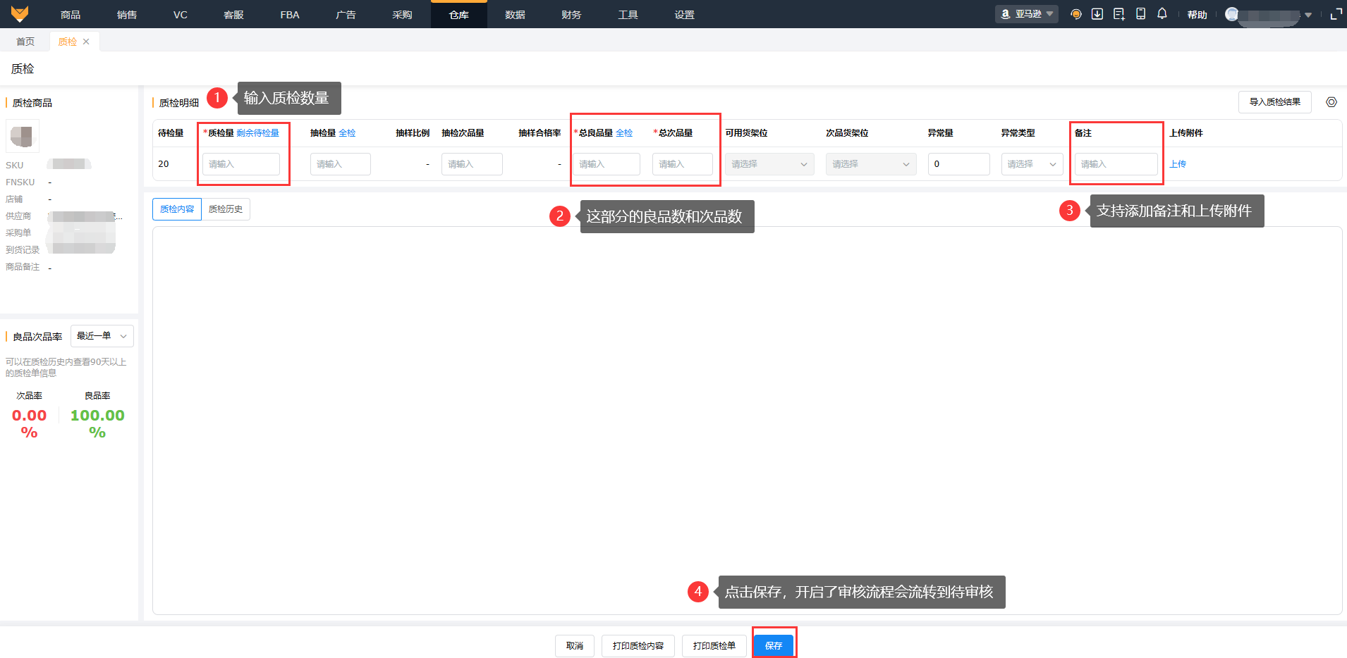 进入【仓库】>【质检单】,在“质检任务”页,点击“质检”,输入已经质检的数量,这部分数量里的良品数和次品数,支持添加备注和上传附件,点击“保存”即可;