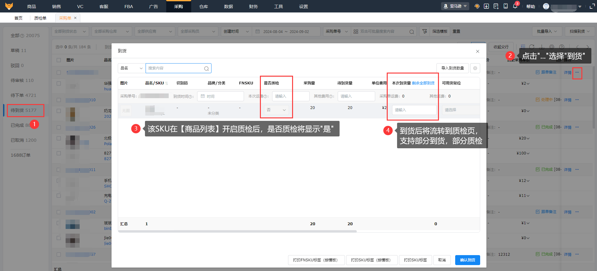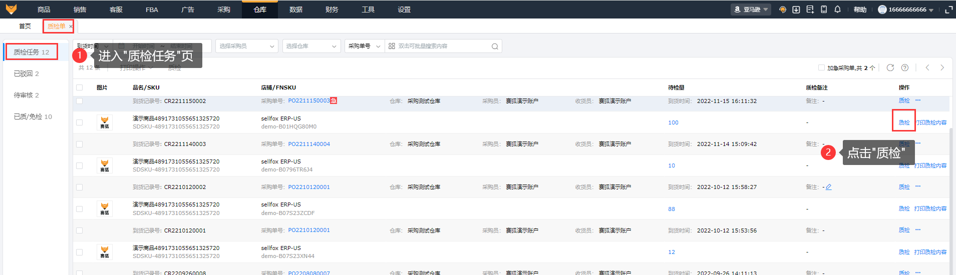 商品开启质检流程后,只要该SKU有采购待到货状态的商品,操作到货后都会进入【仓库】>【质检单】的质检任务页;部分到货也能进行质检。