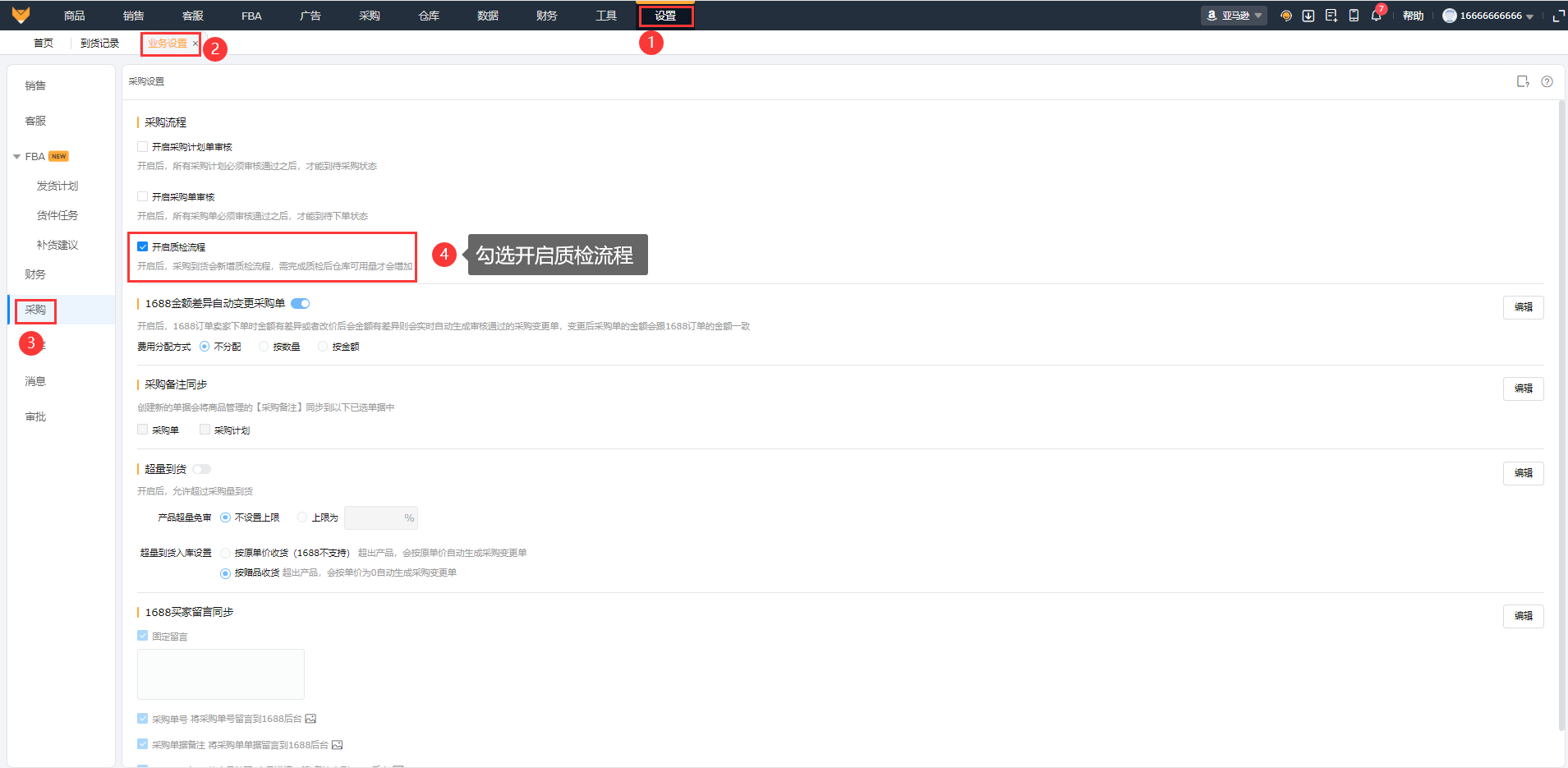 1.1在【设置】>【业务设置】>采购,勾选“开启质检流程”,即可开启使用该功能;