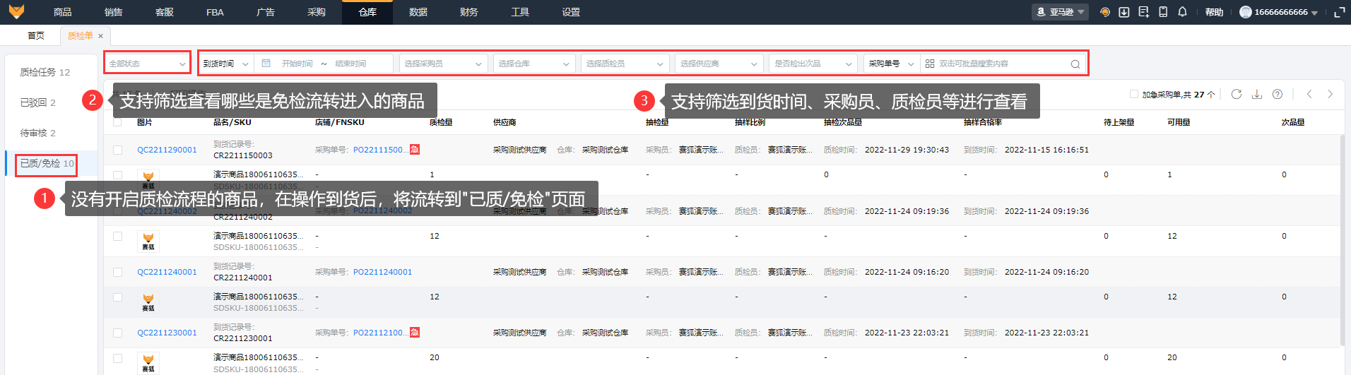 没有开启质检流程的商品,在操作到货后,将流转到“已质/免检”页面;支持通过筛选查看哪些是免检流转进入的商品;支持筛选到货时间、采购员、质检员、供应商、是否检出次品进行查看。