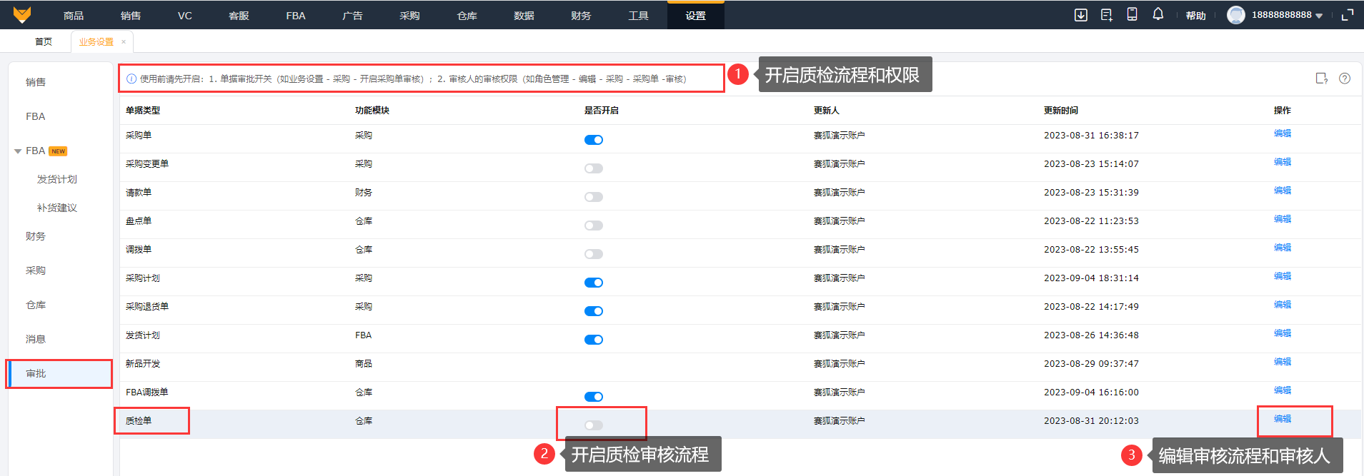 在【设置】>【业务设置】>【审批】,开启质检单的审批流程,编辑审核流程和审核人等。