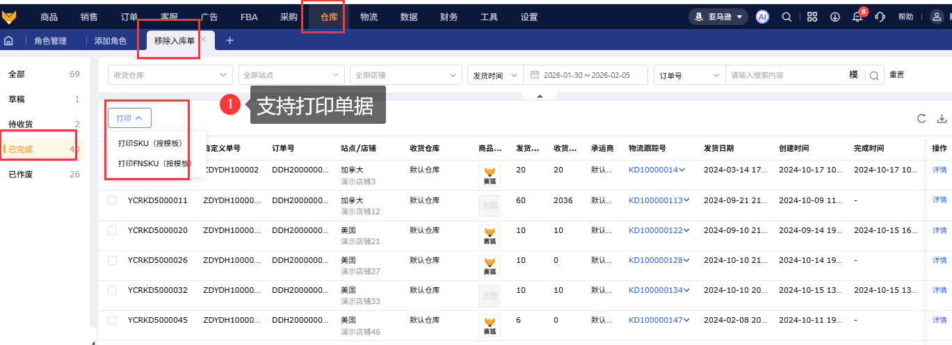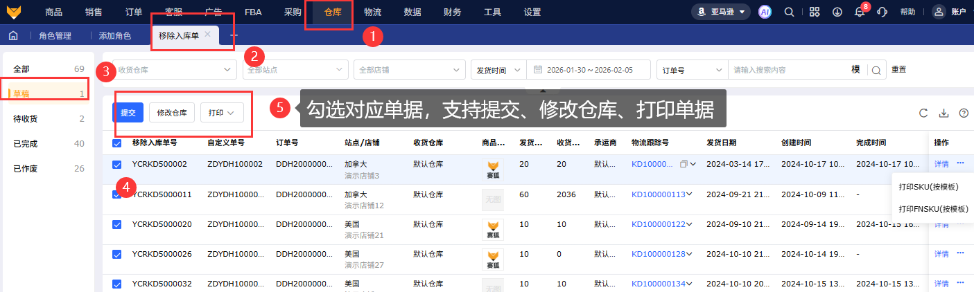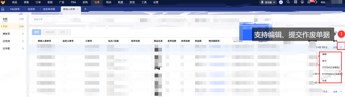 在【移除订单】-【移除货件报表】页面创建移除入库单,操作保存后单据进入草稿状态,支持提交、打印、修改仓库、作废、编辑单据。
