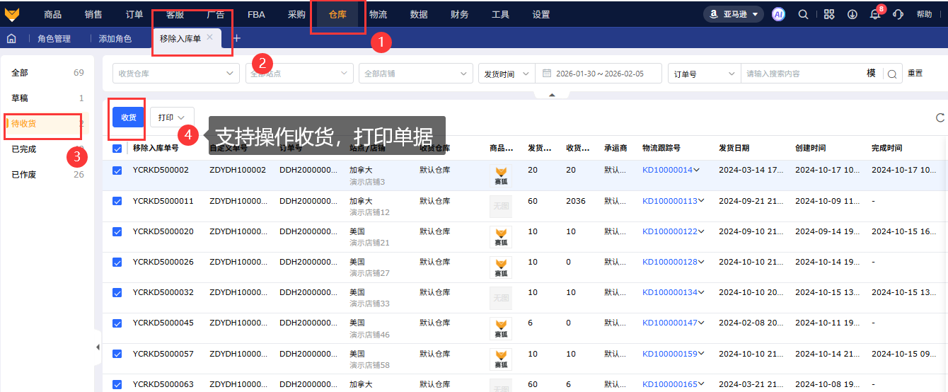 在【移除订单】-【移除货件报表】页面创建移除入库单,保存并提交后单据进入待收货状态,可确认收货,支持打印、作废单据、结束剩余到货。(支持超量收货、少收)