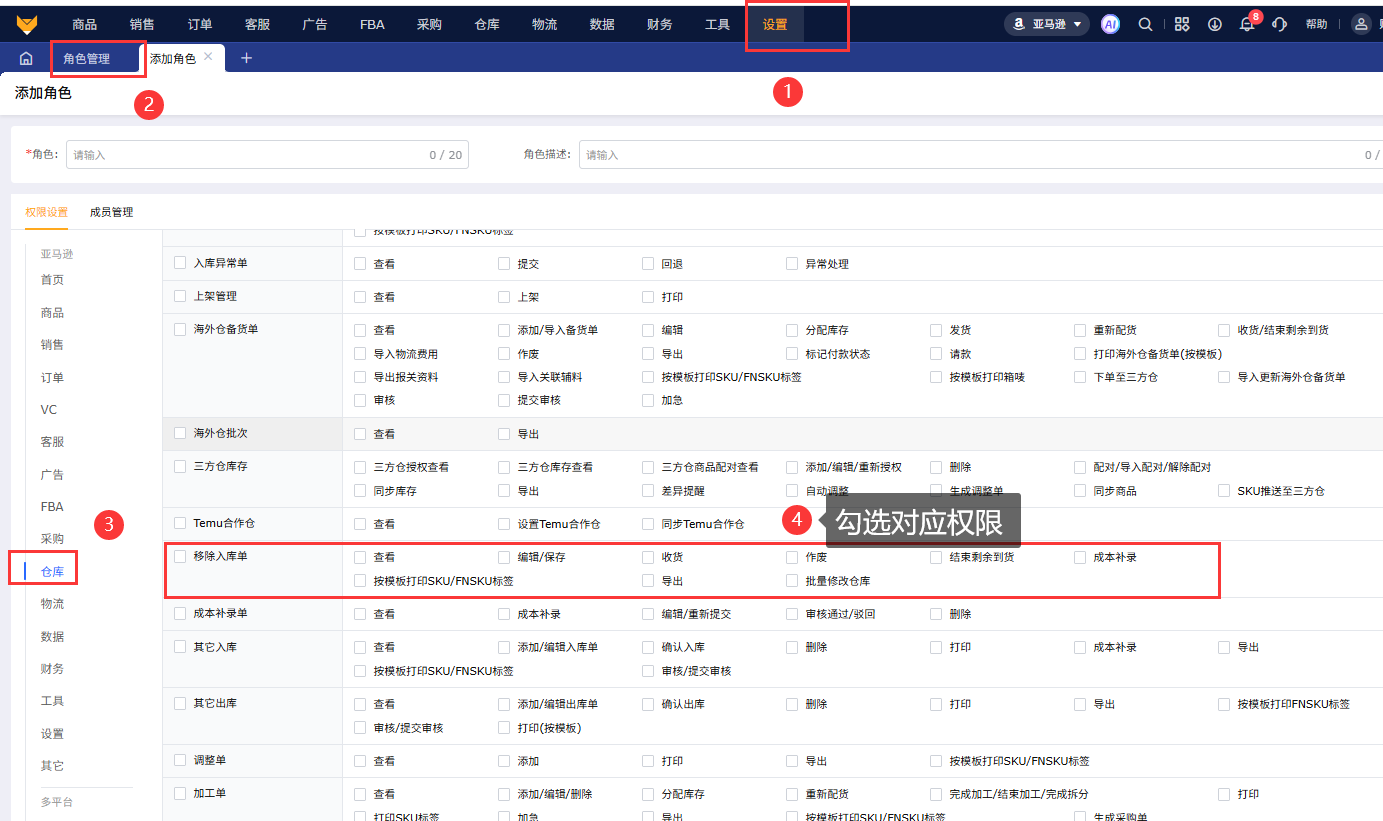 在【角色管理】中开启移除入库单权限。