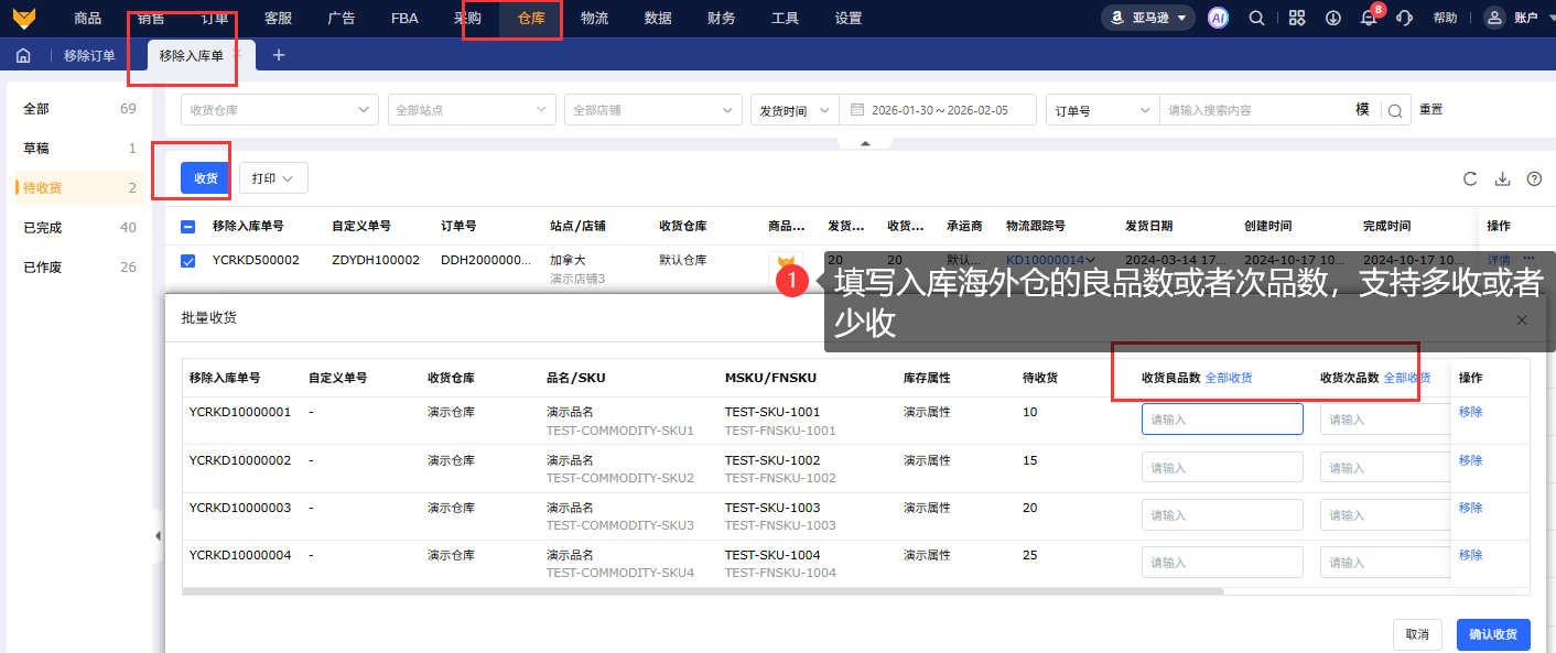 针对移除订单产生的移除库存进行海外仓收货操作。