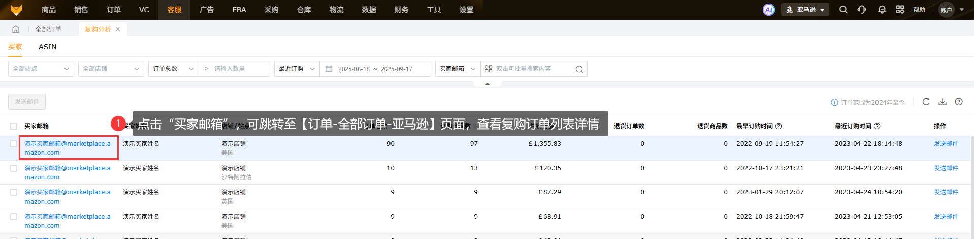 3.点击“买家邮箱”,跳转至【订单-全部订单-亚马逊】页面,查看复购订单列表详情;
