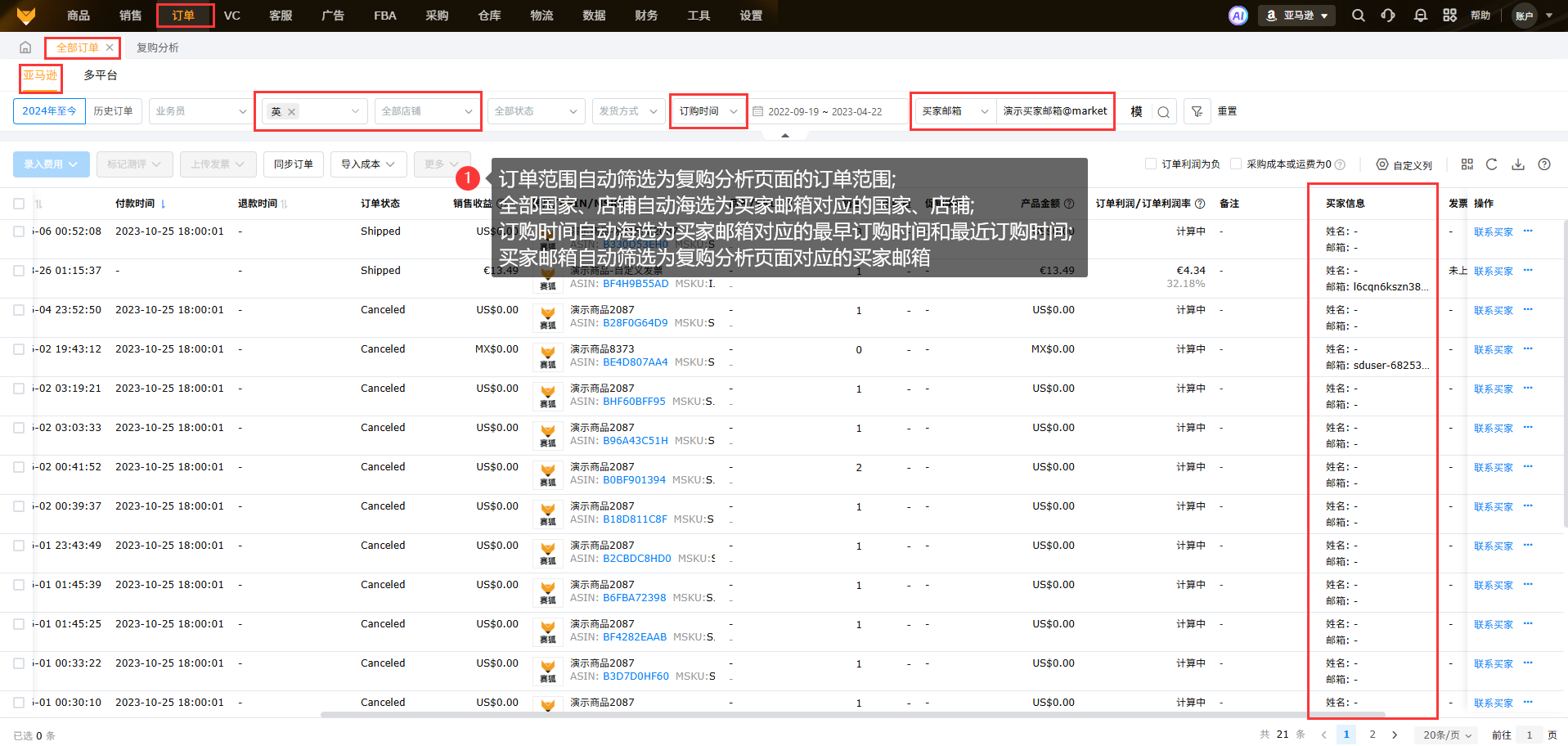 【订单-全部订单-亚马逊】页面的订单范围、买家邮箱、全部国家、全部店铺、订购时间,自动筛选为复购订单页面的订单范围、买家邮箱、以及买家邮箱对应的国家、店铺、最早订购时间和最近订购时间。