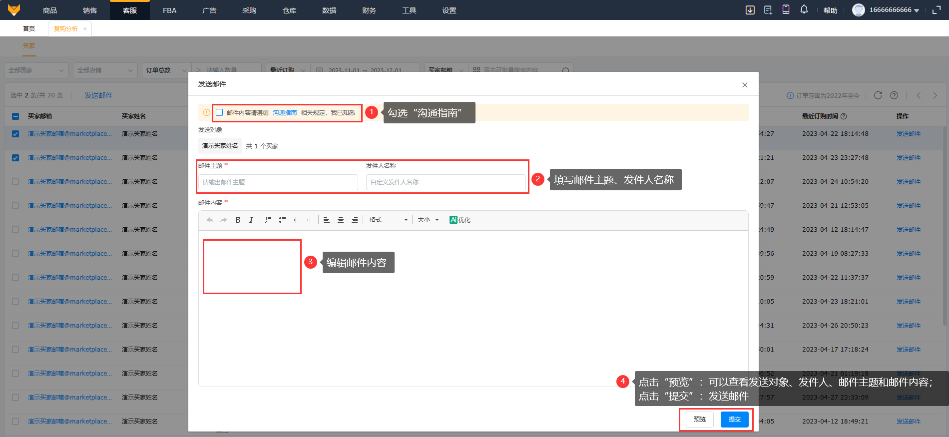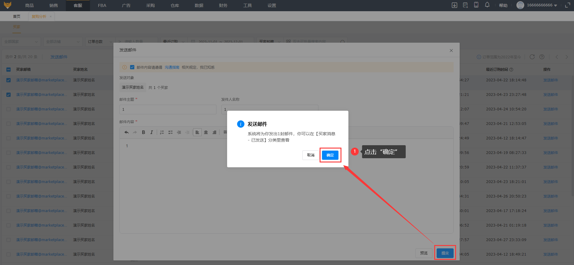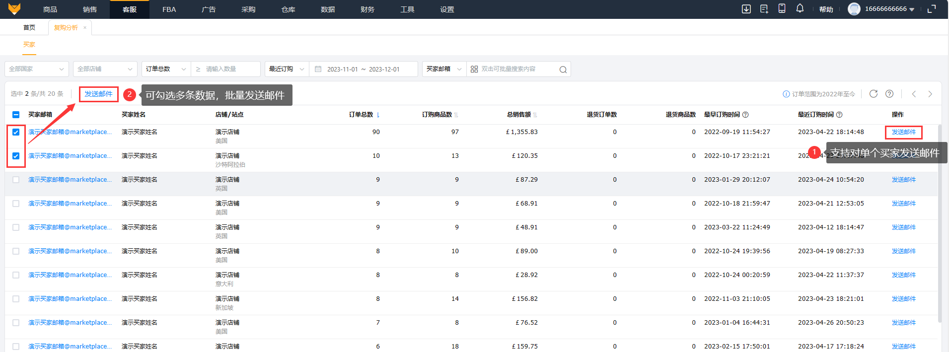 支持对复购买家发送邮件,可对单个买家发送邮件,也可对多个买家进行批量发送。