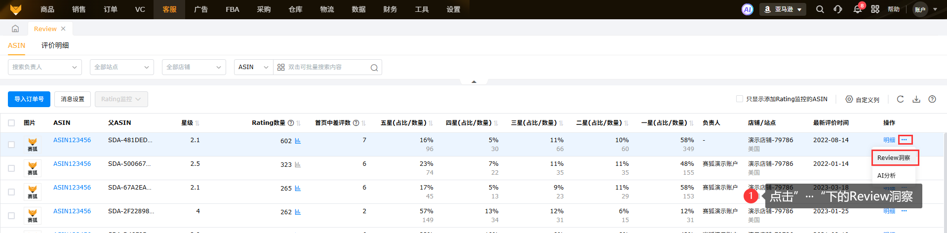 在ASIN维度,点击“...”-“Review洞察”,可以进入到该ASIN的Review洞察页面;