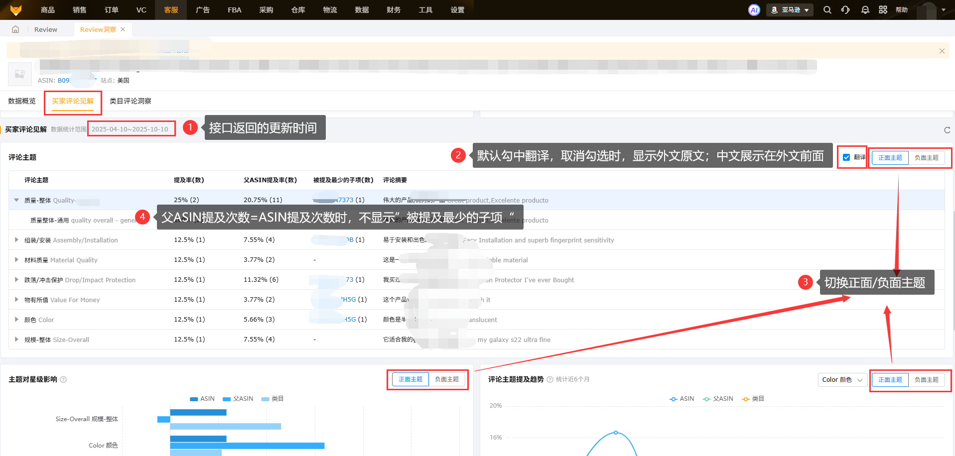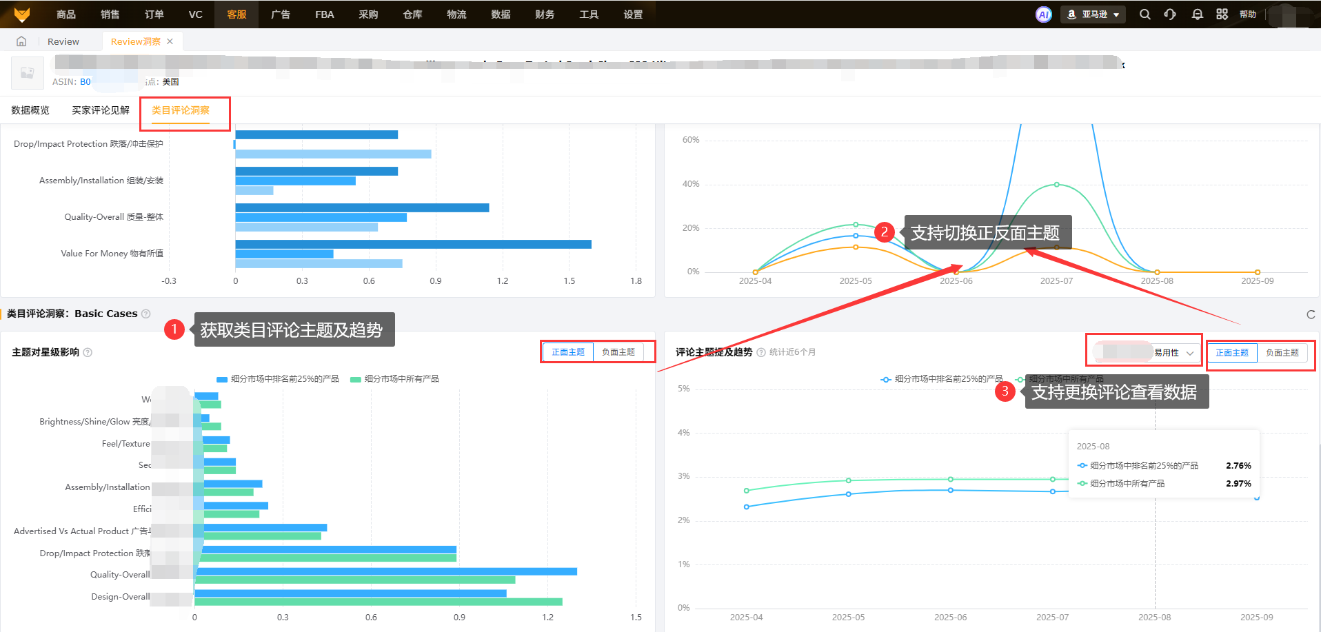 主题对星级影响和评论主题提及趋势:默认对比维度是细分类目时长中排名前25%的产品和所有产品。