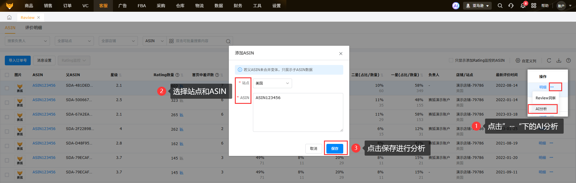 在ASIN维度,点击操作“...”-“AI分析”可以添加ASIN到Review分析页面,进行Review分析。