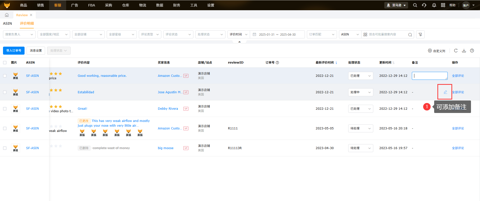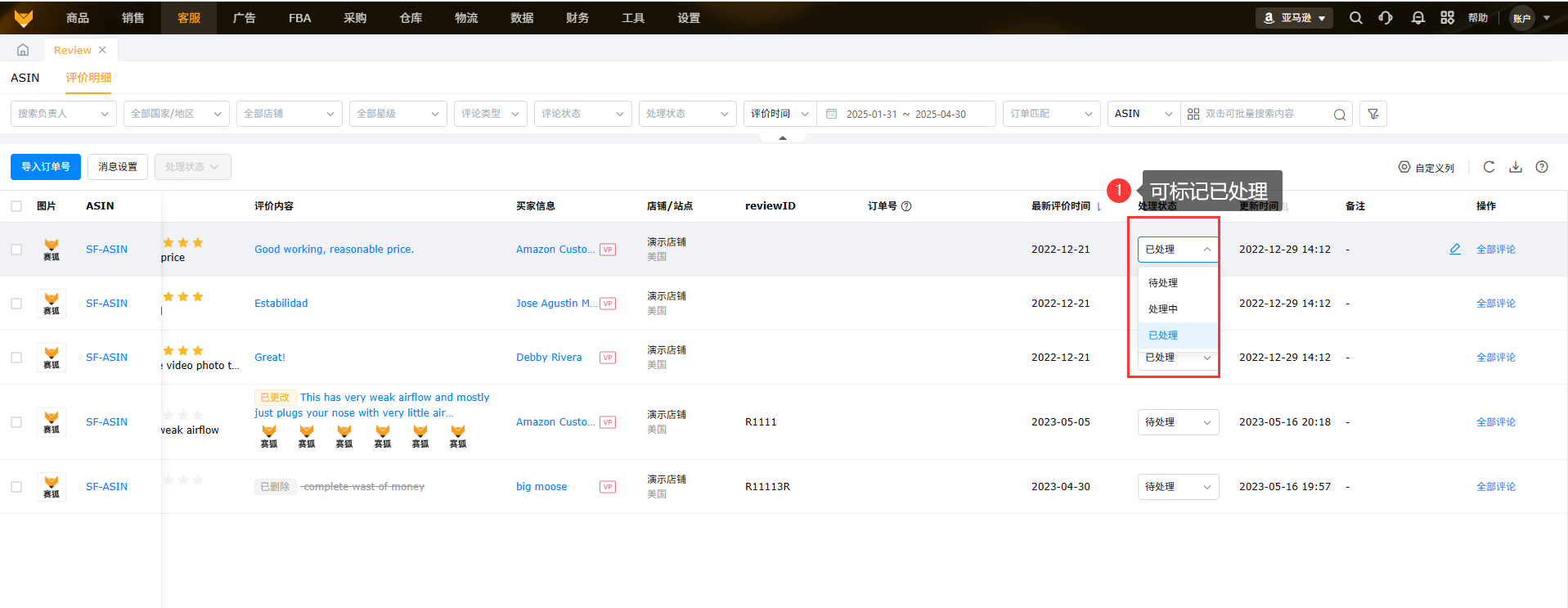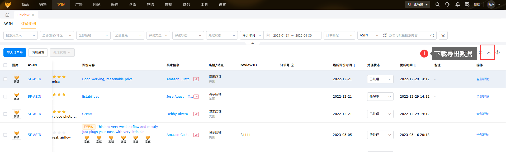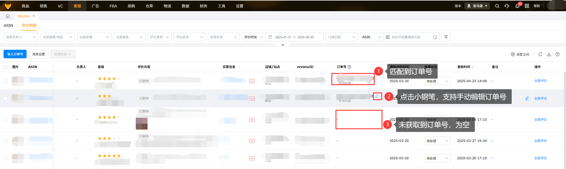 展示所授权店铺下所有ASIN在亚马逊后台的review评价内容,支持订单号匹配,可以快捷定位联系买家。