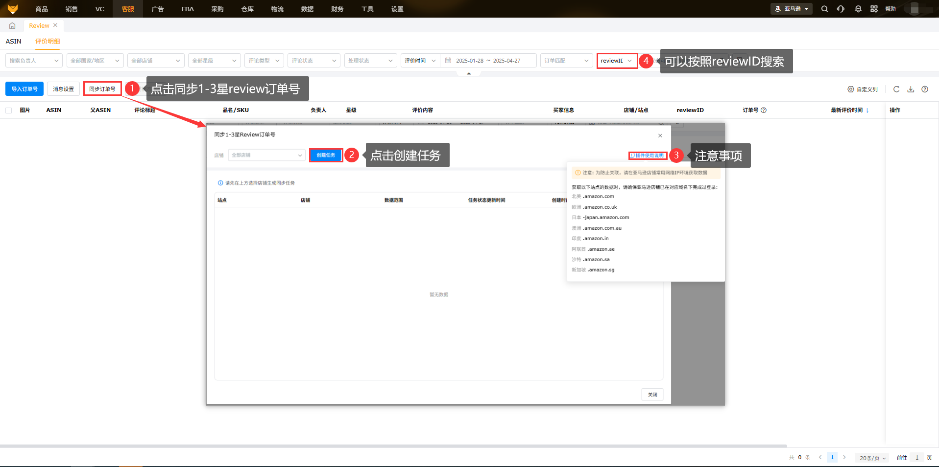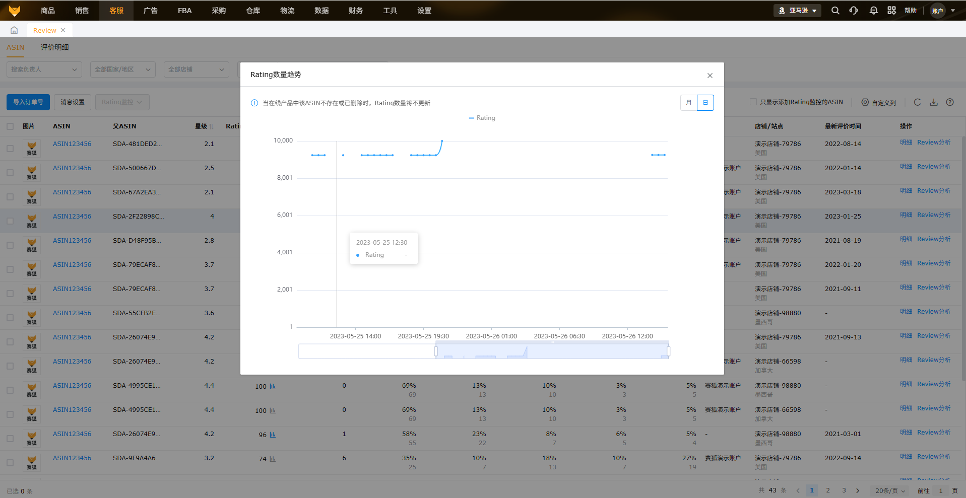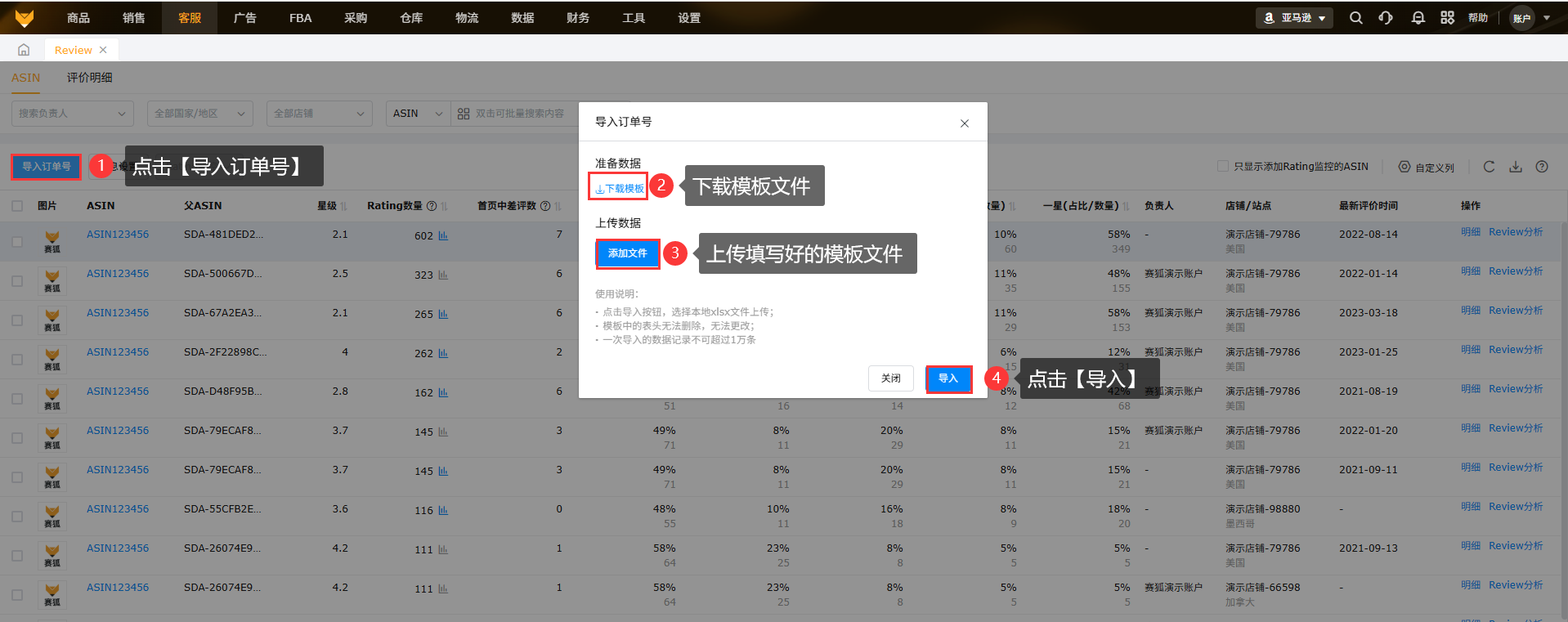 展示所授权店铺下所有ASIN在亚马逊后台的review评价内容,支持订单号匹配,可以快捷定位联系买家。