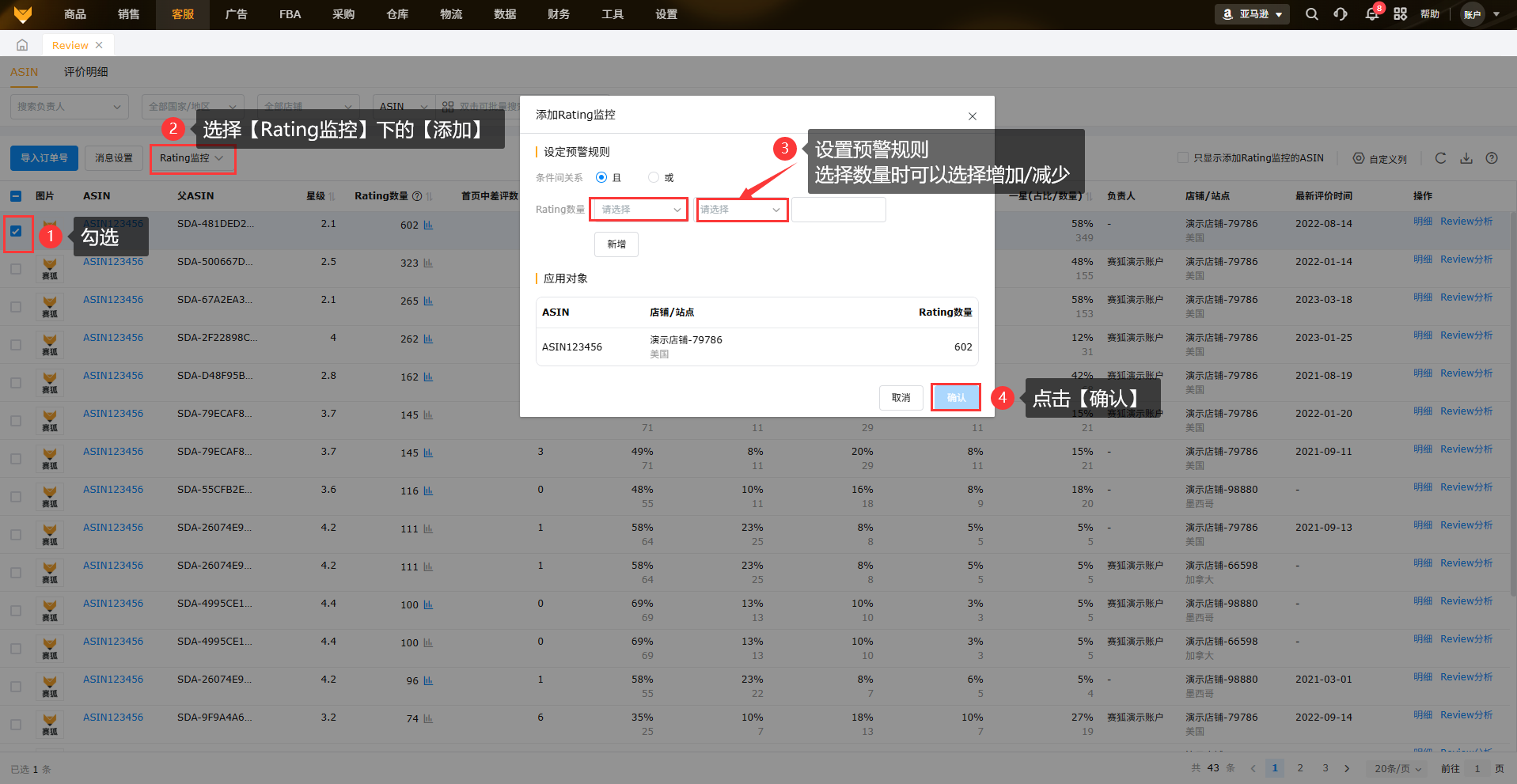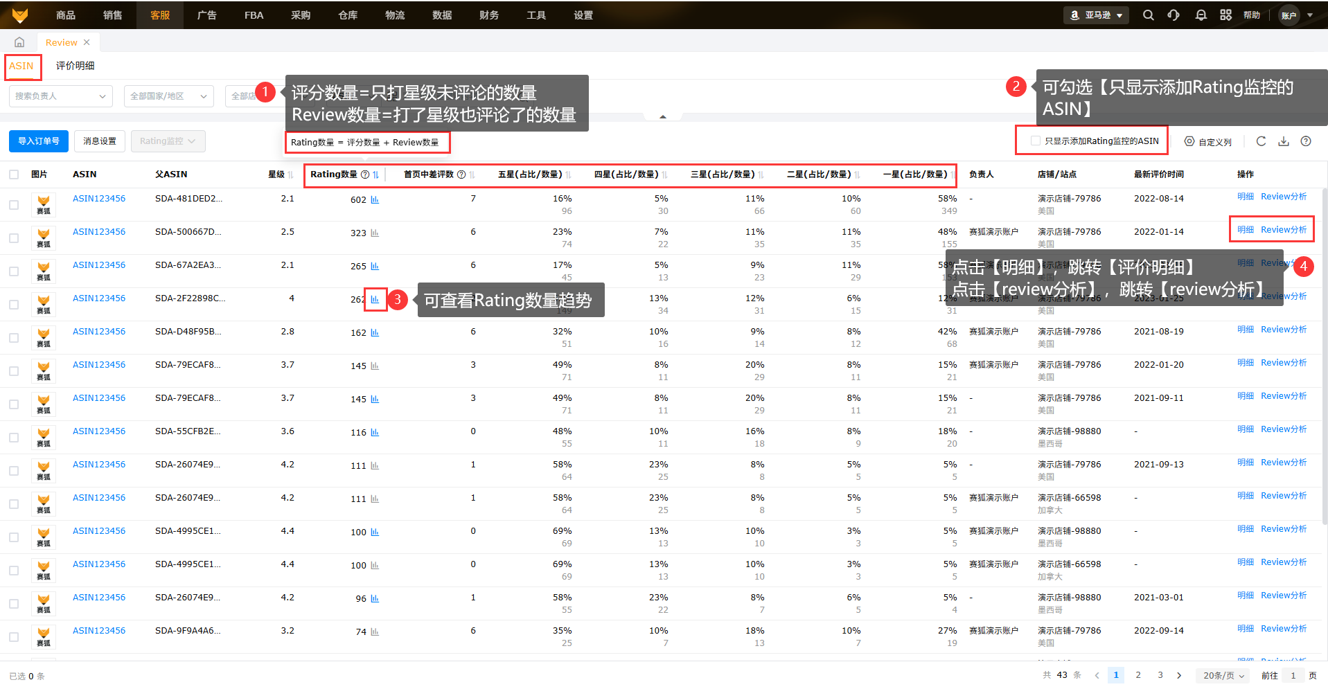 查看ASIN的评分汇总以及每个ASIN的评价明细,对收到的差评及时跟进和处理。