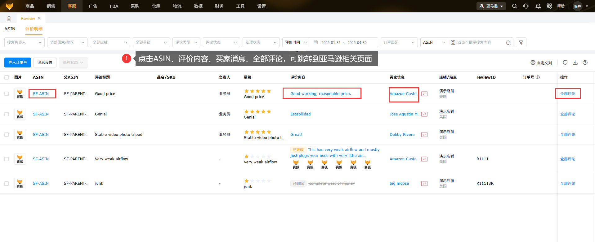 (2)点击产品ASIN、评价内容、买家信息、全部评论,可跳转到亚马逊相关页面。