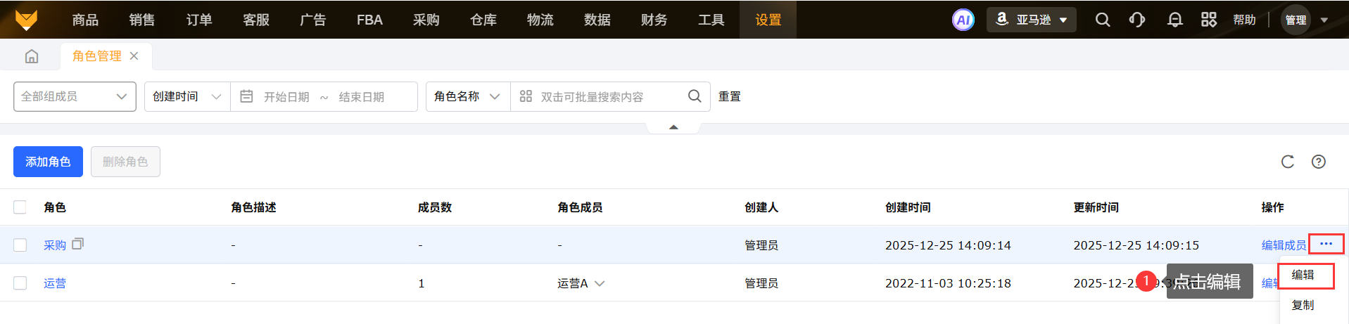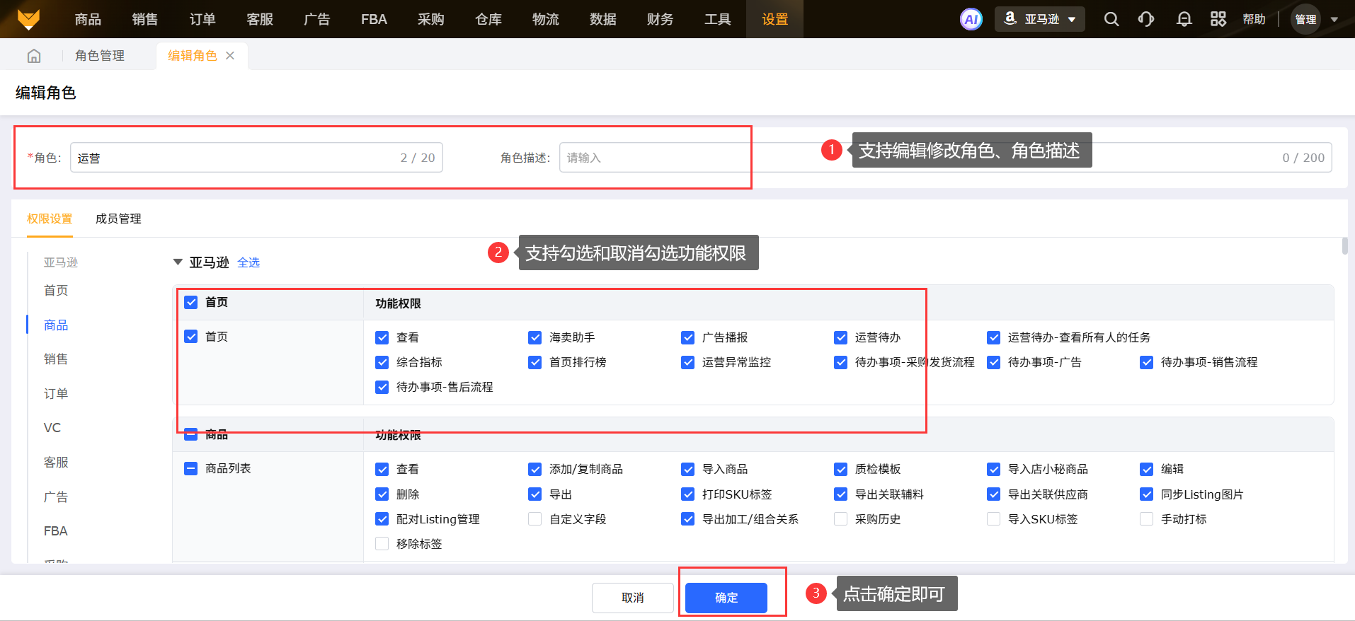 支持编辑修改角色权限,点击编辑,直接勾选和取消勾选对应功能,然后点击【确定 】即可完成修改;