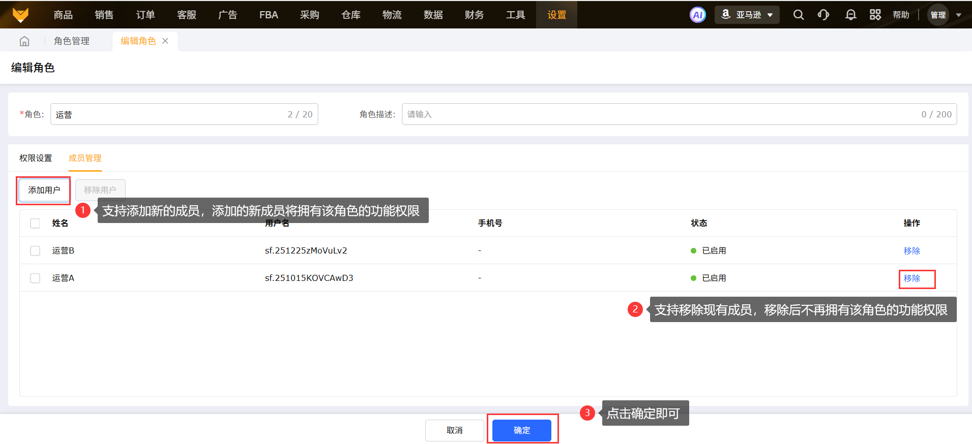 可以在成员管理里面添加用户,前提是已经在【设置】-【子账号】页面开通了子账号,添加的用户将拥有该角色下的功能权限。