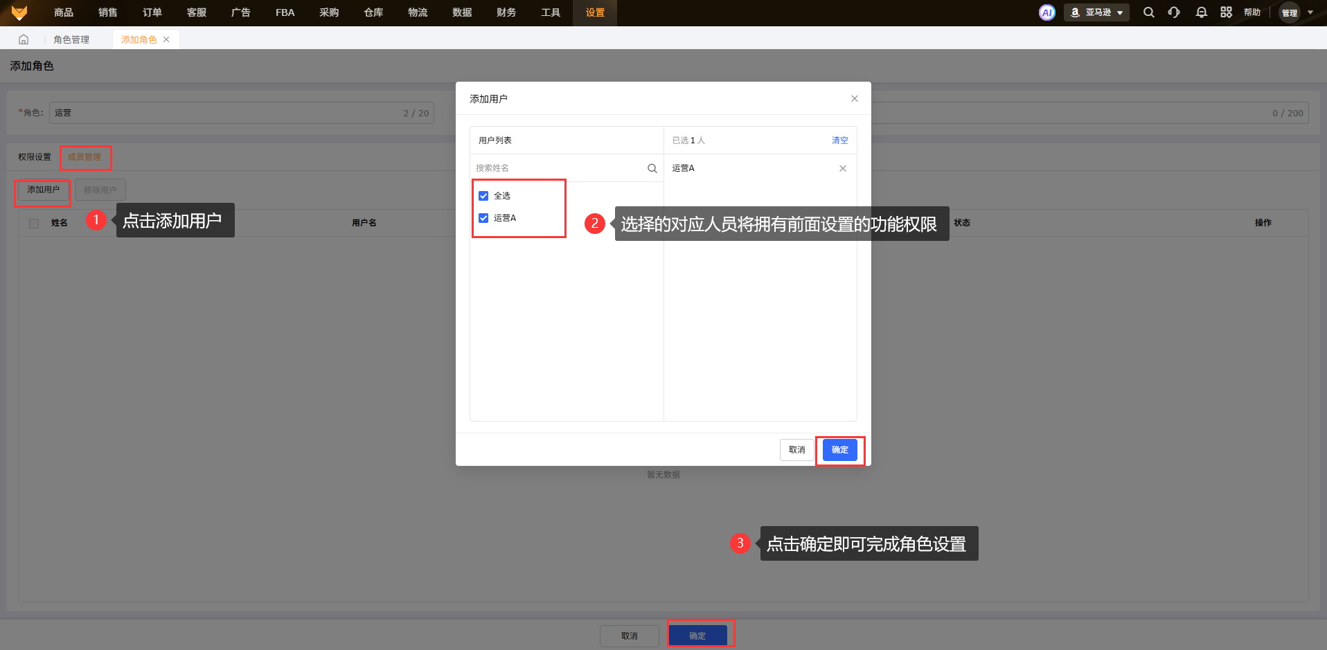 A1:可以先在【角色管理】页面设置一个角色,勾选功能权限后添加成员或者在【子账号】页面给员工分配这个角色,以及相应店铺权限。