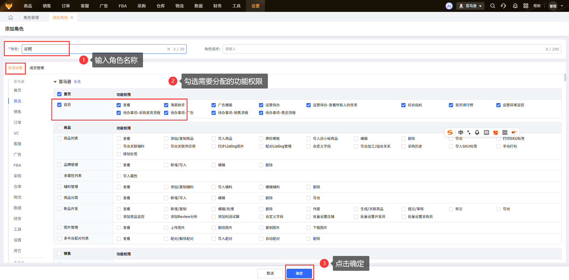 填写基本信息,包括角色、角色描述,根据对应角色勾选功能权限,点击【确定】即可 。
