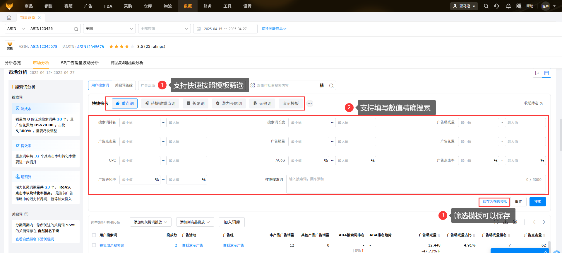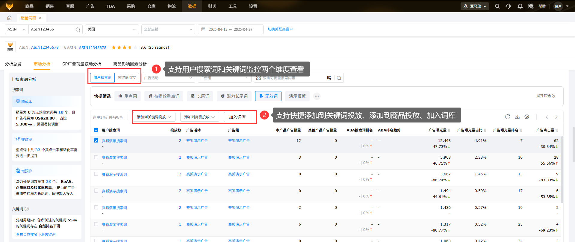 3.1 分析周期内目标产品的用户搜索词波动情况,降本增效,从广告用户搜索词来看,帮助卖家分析其中哪个关键词的排名增长和下滑。关键词监控数据源:关键词排名
