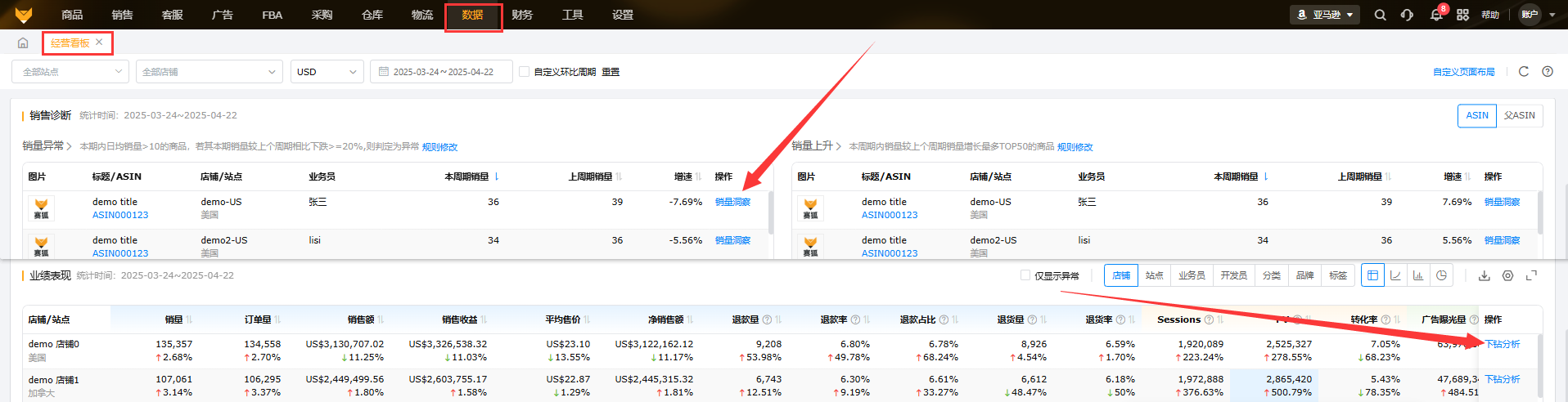1.7 数据模块-经营看板-销售诊断,业绩表现-下钻分析