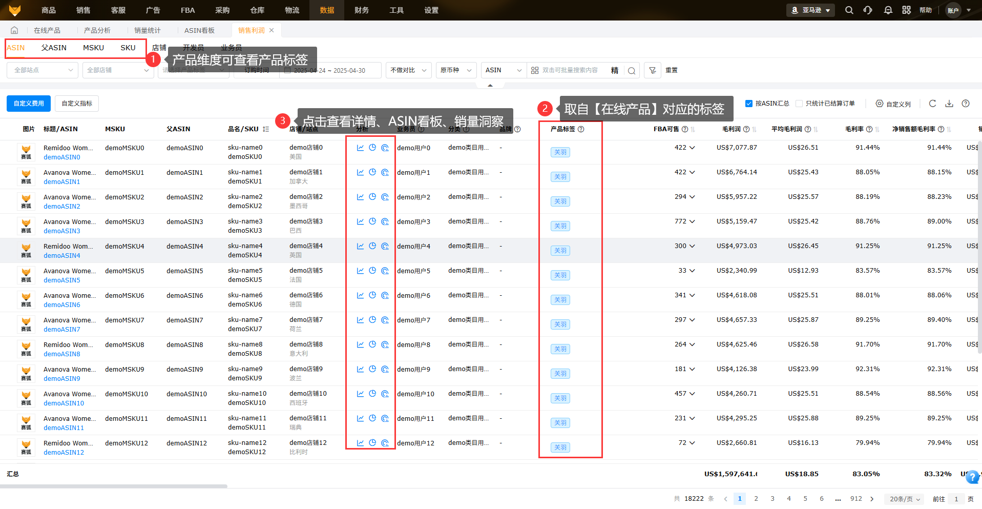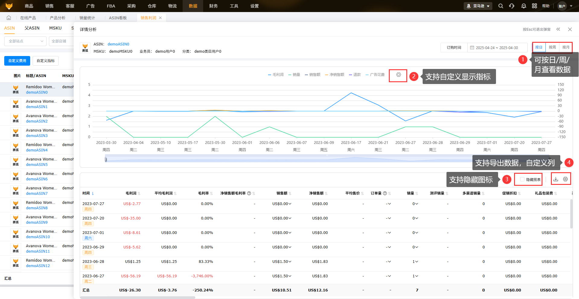 ASIN、父ASIN、MSKU、SKU四个维度都有“分析”功能,点击“分析”图标,以列表或者图形的方式查看日/周/月的数据;展示对应产品标签方便筛选归类,并且支持跳转【ASIN看板】页面查看数据