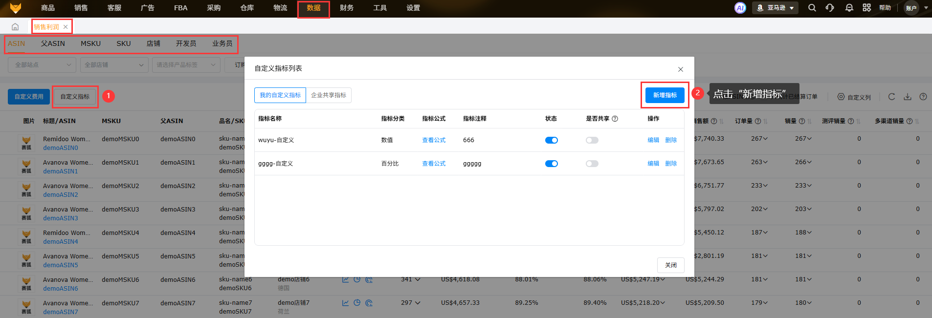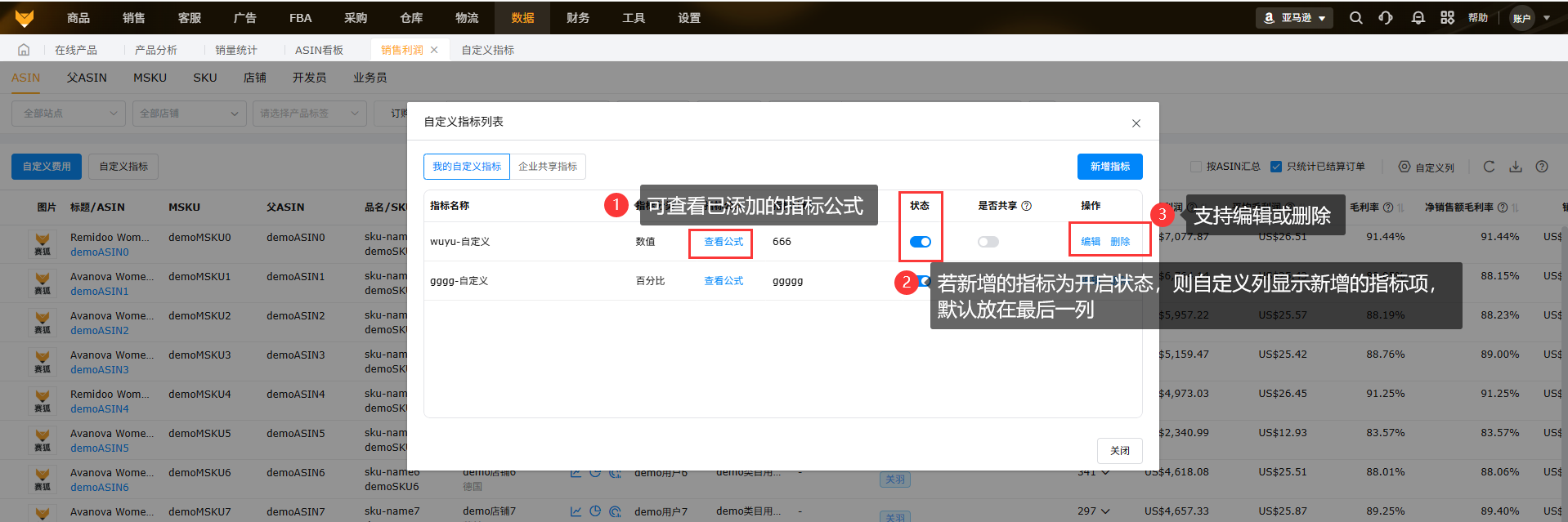 (2)可通过自定义指标设置,产品维度查看产品的毛利润,店铺维度查看店铺的毛利润,互不影响;