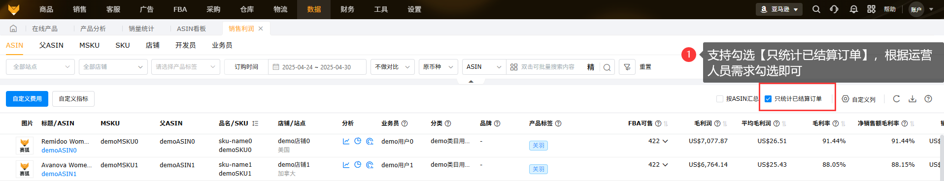 只统计已结算订单:勾选状态下,则只统计已产生费用的订单数据。Pending、Unshipped和小部分未产生费用的Shipped的订单暂不统计,费用更新后,系统自动修正数据。