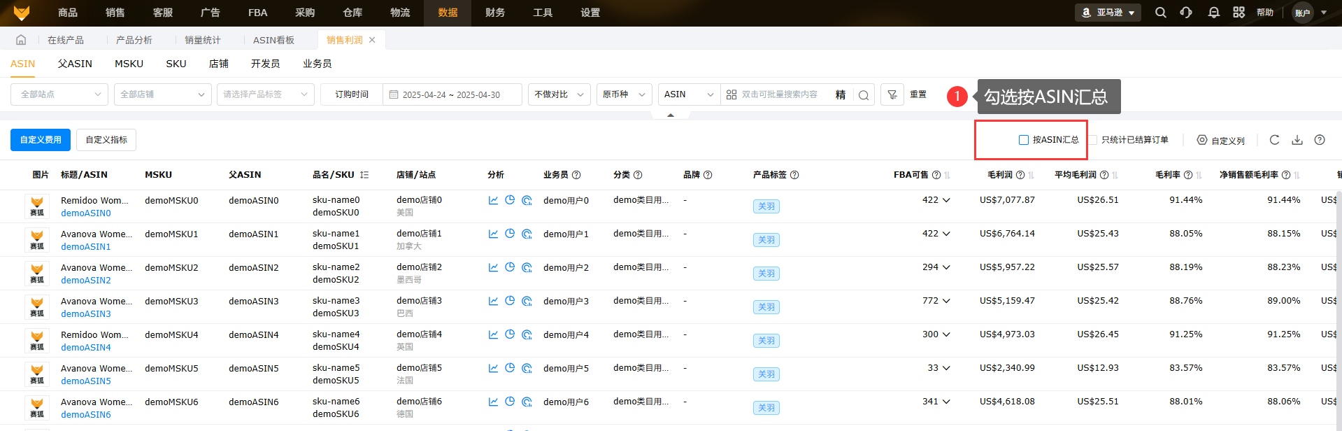 勾选“按ASIN汇总”,系统会将多个相同ASIN数据汇总在一起,也可以展开查看每个ASIN的相关数据。