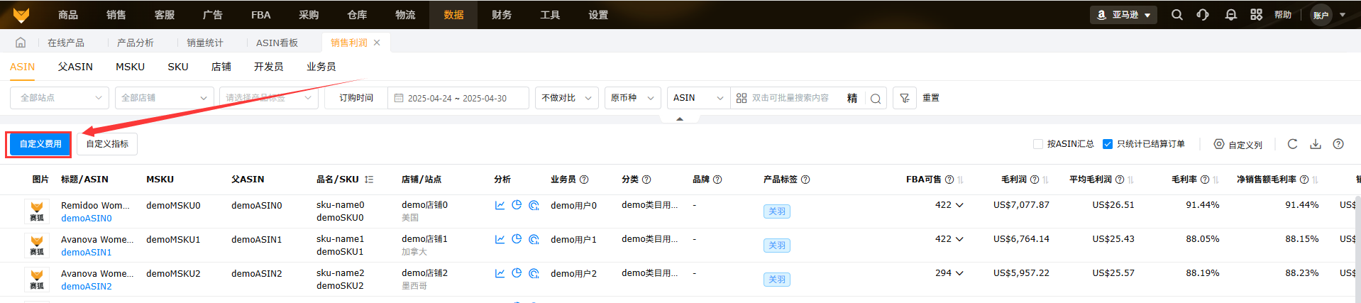 入口:销售利润ASIN维度,以及父ASIN、MSKU、SKU、店铺维度均有入口;点击自定义费用即可进入自定义费用页面。