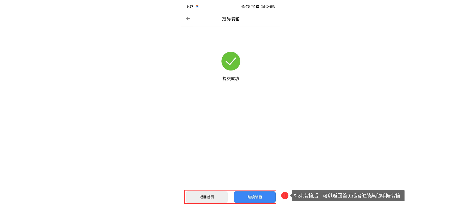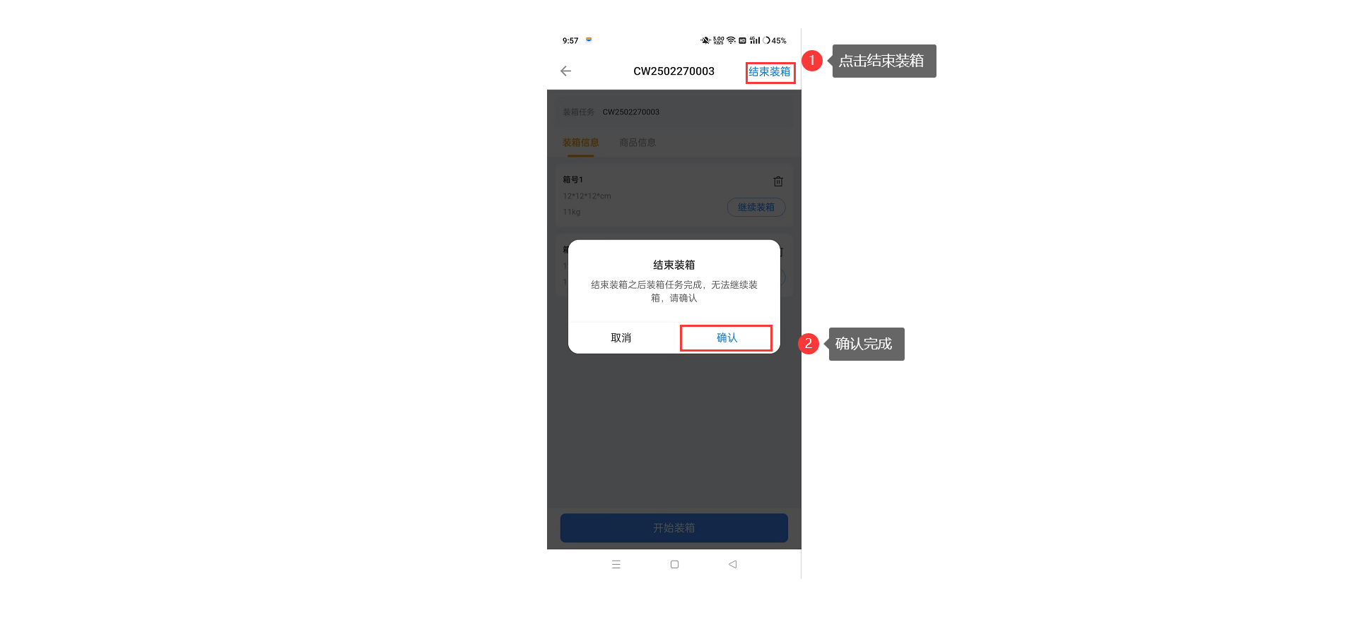 单据完成所有装箱后,可以操作“结束装箱”,结束装箱后装箱任务完成,无法继续装箱,操作结束装箱时需要有已经保存的装箱信息,如果之前装箱信息点击结束装箱,会有报错提示“无装箱信息,无法继续”