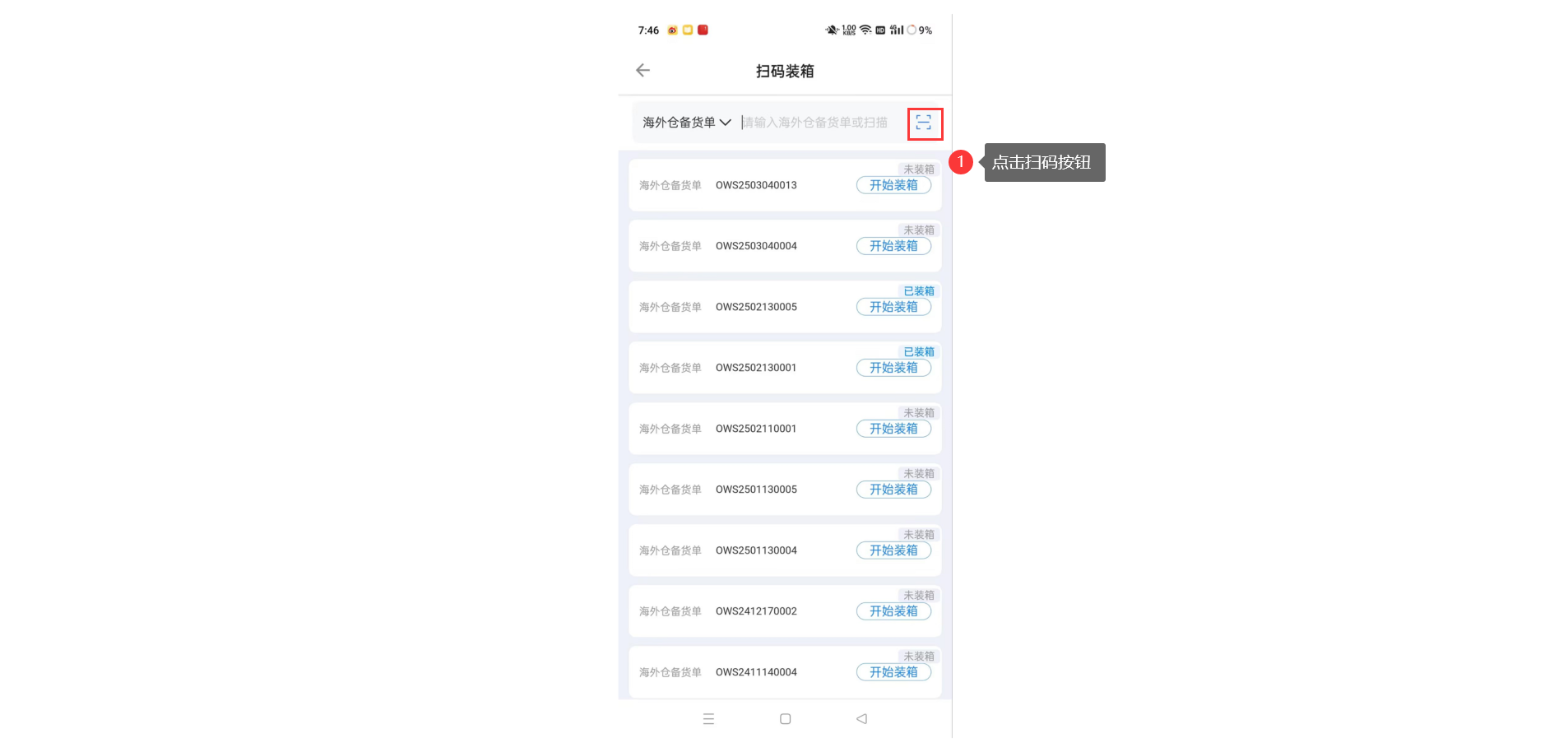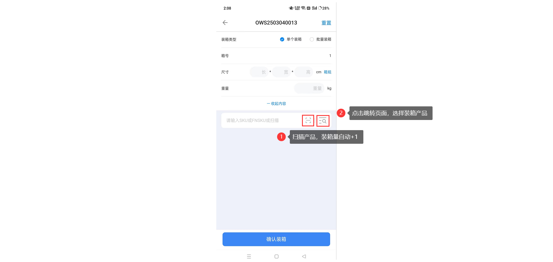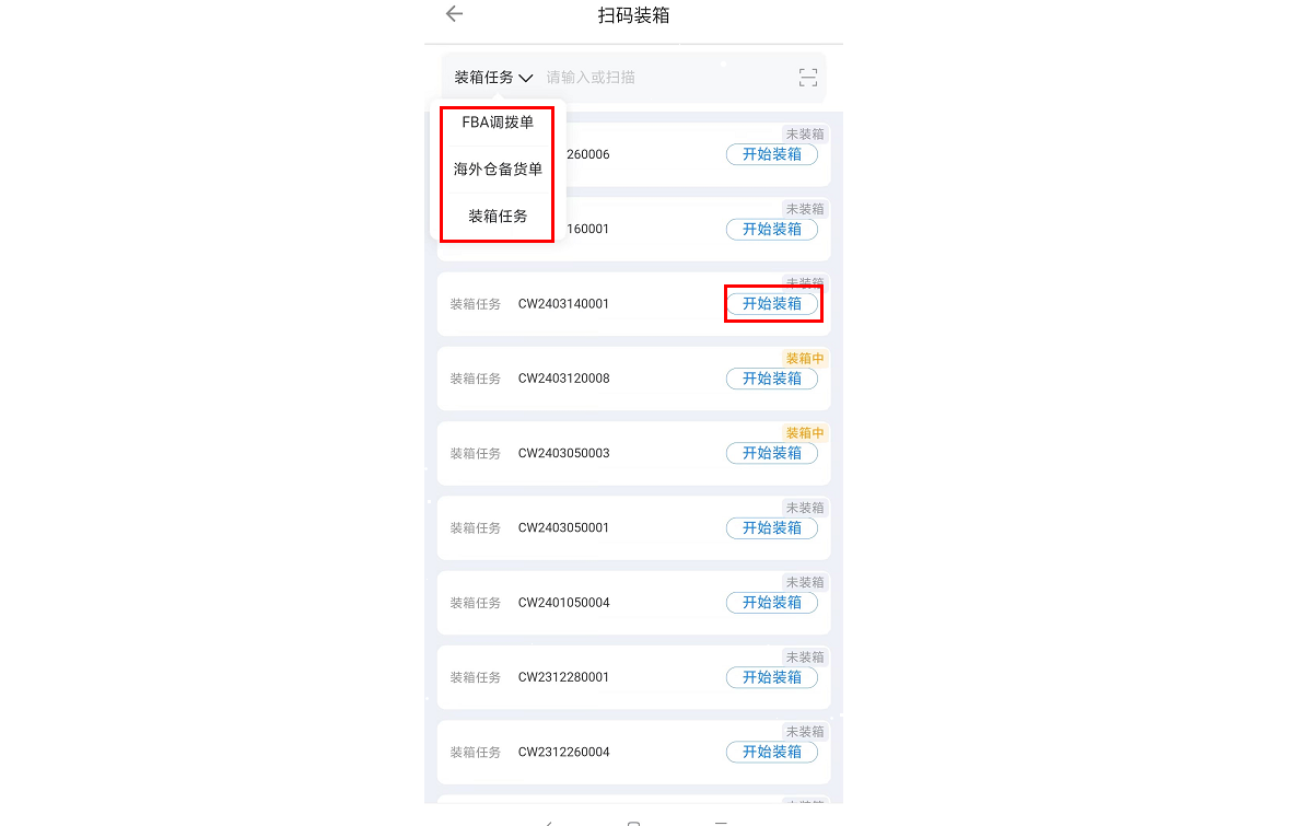输入或扫描单据,支持FBA调拨单,海外仓备货单,装箱任务的装箱。